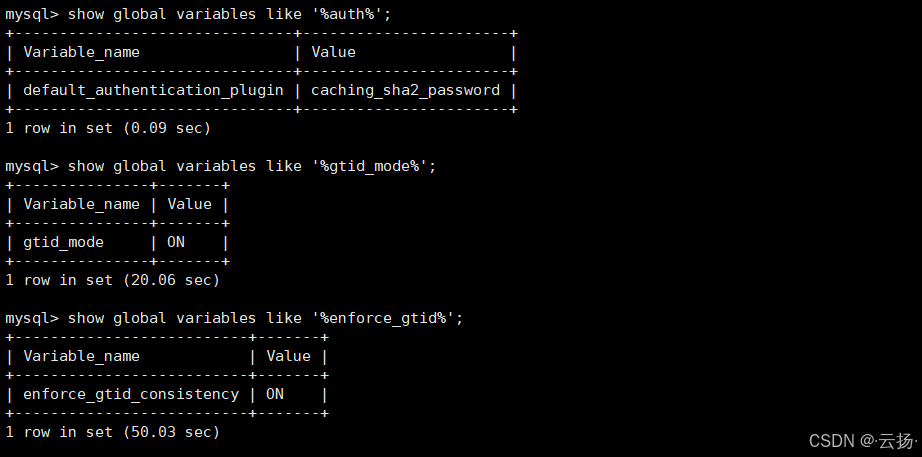 sqlshow global variables like "%auth%"; show global variables like "%gtid_mode%"; show global variables like "%enforce_gtid%";