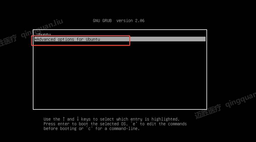 - 进入【GRUB】界面选择【Advance options for Ubuntu】