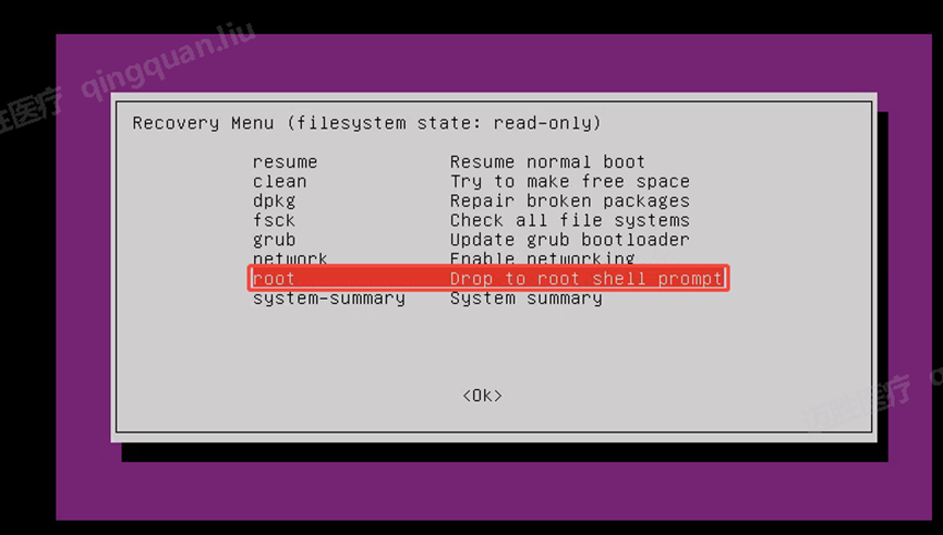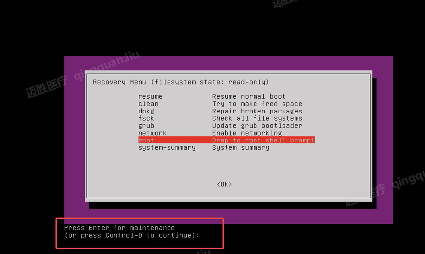 - 选择【Root drop to a root shell prompt】模式,(等待时间可能比较长)