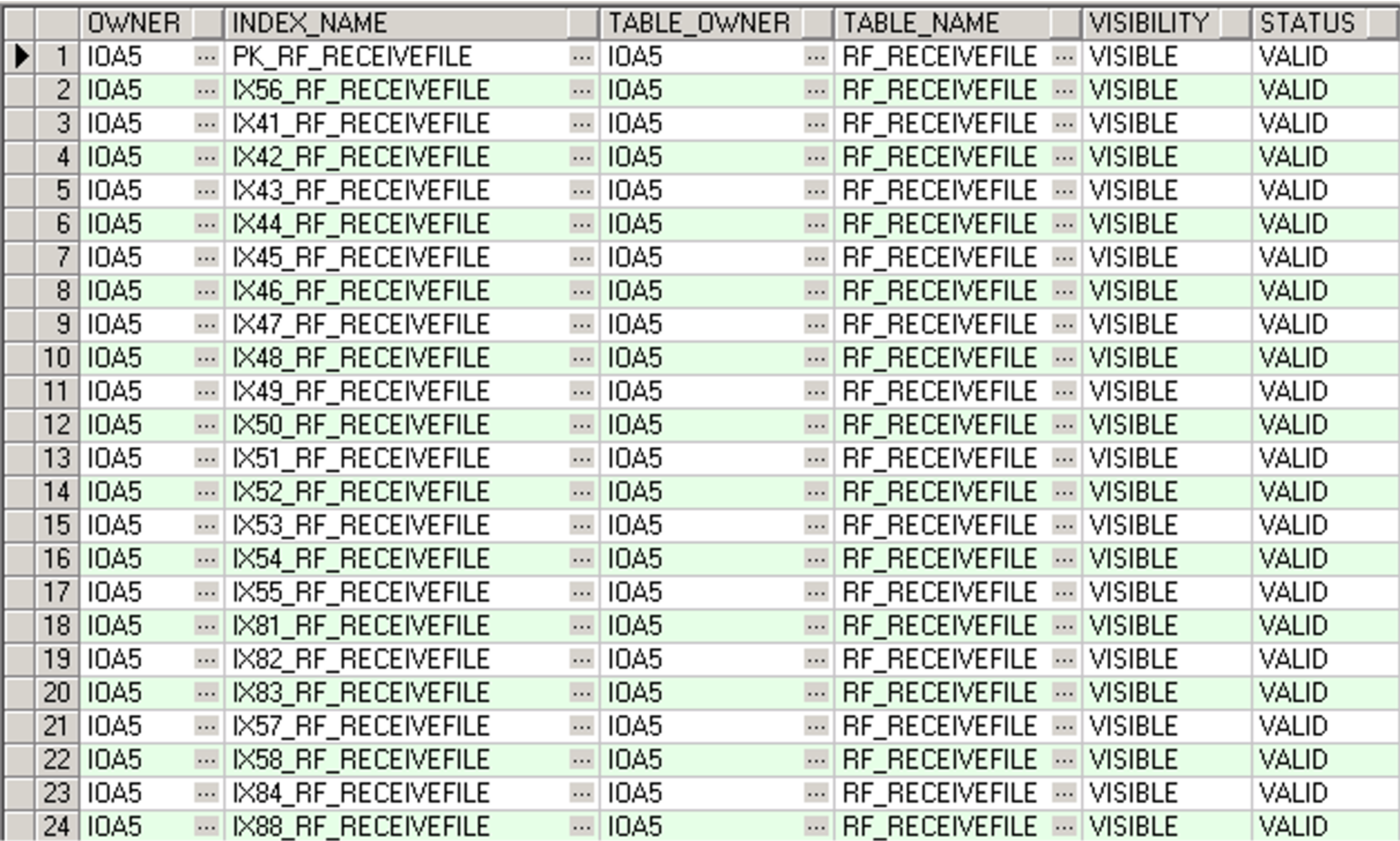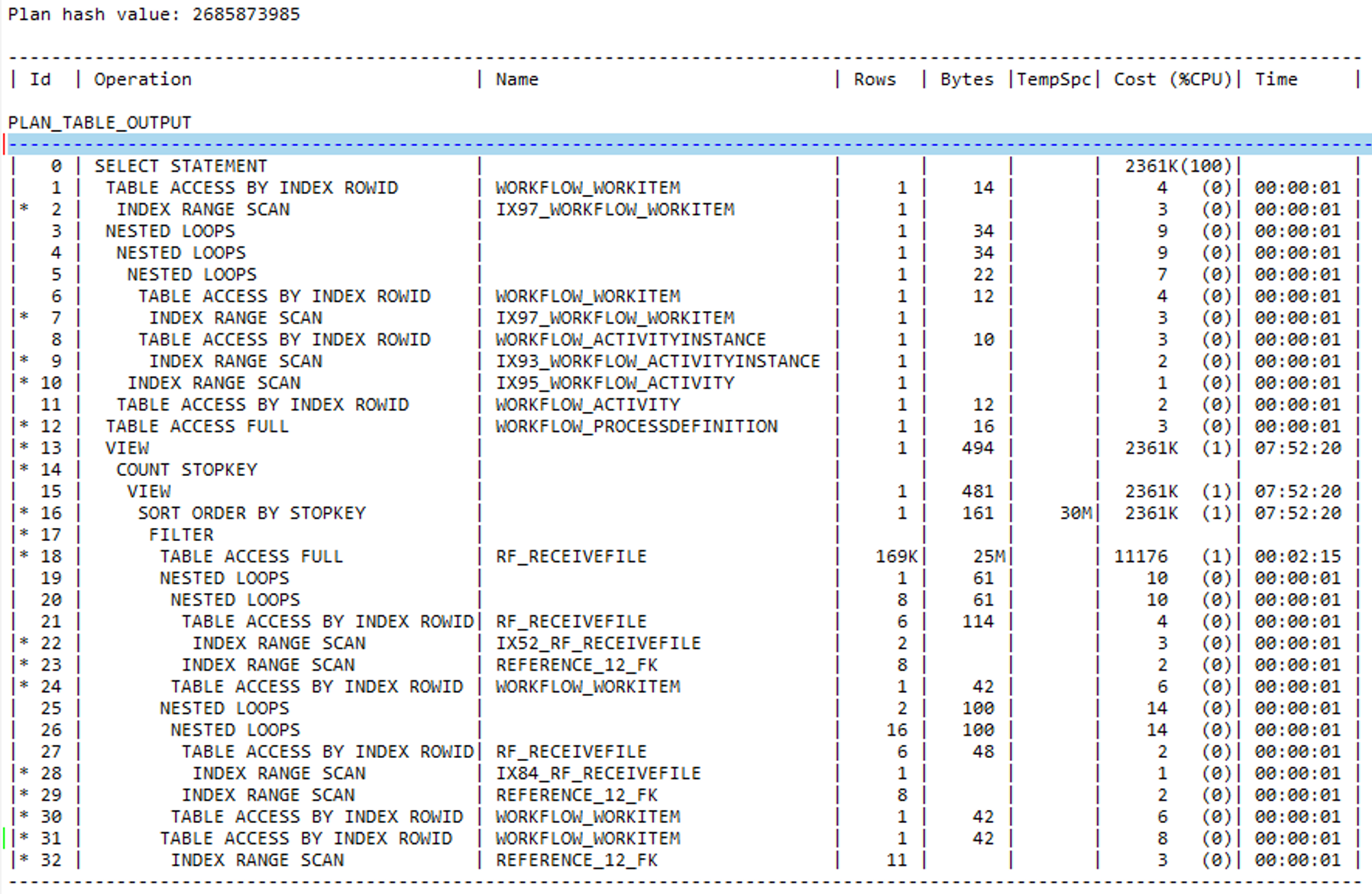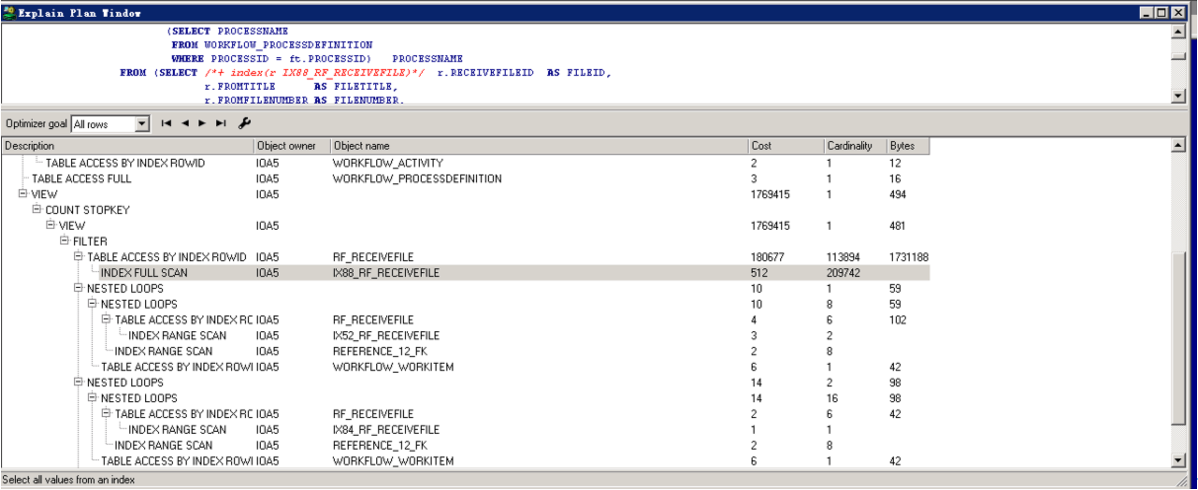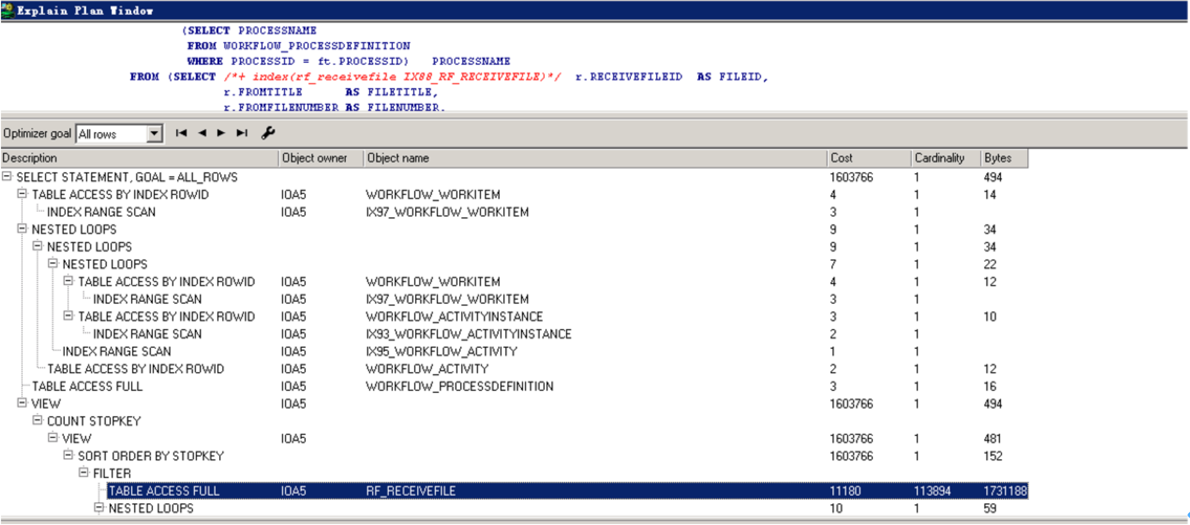 对比两边的执行计划,发现IOA5.RF_RECEIVEFILE表测试环境上走索引,生产环境上面走的是全表扫描。
