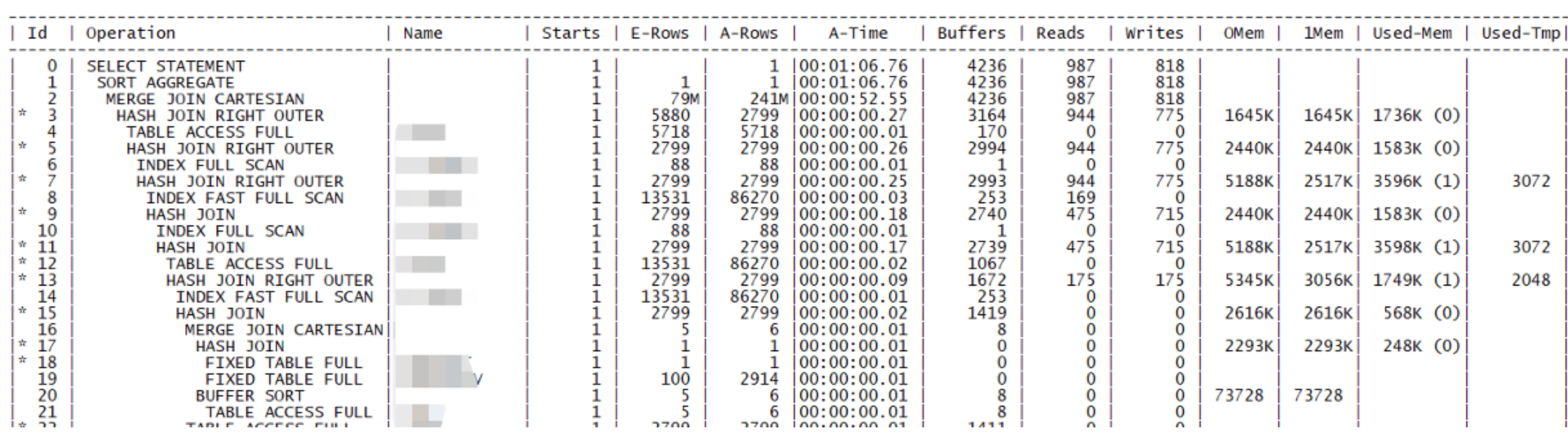 第三,在定位性能问题时,不能只看静态执行计划,更要结合实际执行统计。通过设置 statistics_level=all,再用 dbms_xplan.display_cursor 带 allstats last 的方式输出执行信息,对比估算行数和实际行数、估算成本和实际耗时,往往可以很快判断出问题是出在统计信息和选择率估计,还是出在 SQL 本身或硬件资源上。