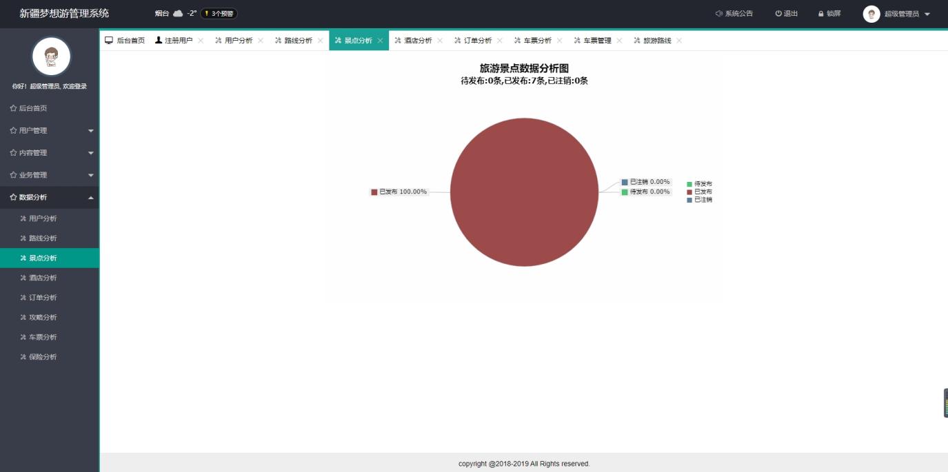 旅游管理系统通过对景区、路线、餐饮住宿、车票、攻略等各个环节进行智能管理和预订操作。该系统本着稳定运行、使用简单化、后期维护方便的原则来开发,能够提高管理者的管理效率,也对新疆旅游业的发展有推进作用。
