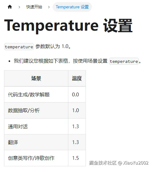 从应用场景,我们可以理解为temperature字段大概是理性与感性的权衡度,逻辑性越强的场景,温度越低;越感性的场景温度越高。所有AI大模型都是类似的,从他们对应的官方文档去获取对应信息就可以了。