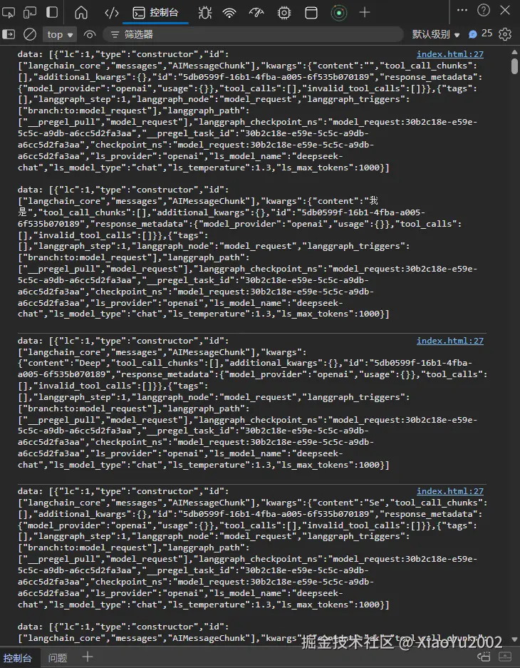 AI对话-流式输出如图11-7所示。会按顺序返回非常多的JSON格式数据,通过data字段下的kwargs的content可以看到AI返回内容以三两字的形式不断输出。并且在前端的接收流式输出,不会因post请求而出现问题。