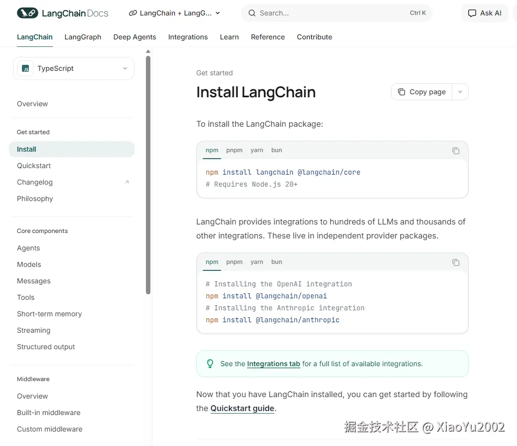 我们这里学习的话,使用第一个LangChain就完全够用。LangChain下载使用说明如图11-2所示。我们点击如图11-1所示的第一个选项后,会跳转到如图11-2所示的界面,需要点击左侧边栏的install选项。官方文档有对应的使用说明。