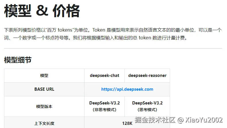 回到index.ts文件,接入DeepSeek大模型之后,ChatDeepSeek有一个model字段,这是用于选择我们模型的。已有的模型类型需要从DeepSeek官方文档中获取:模型 & 价格 | DeepSeek API Docs。