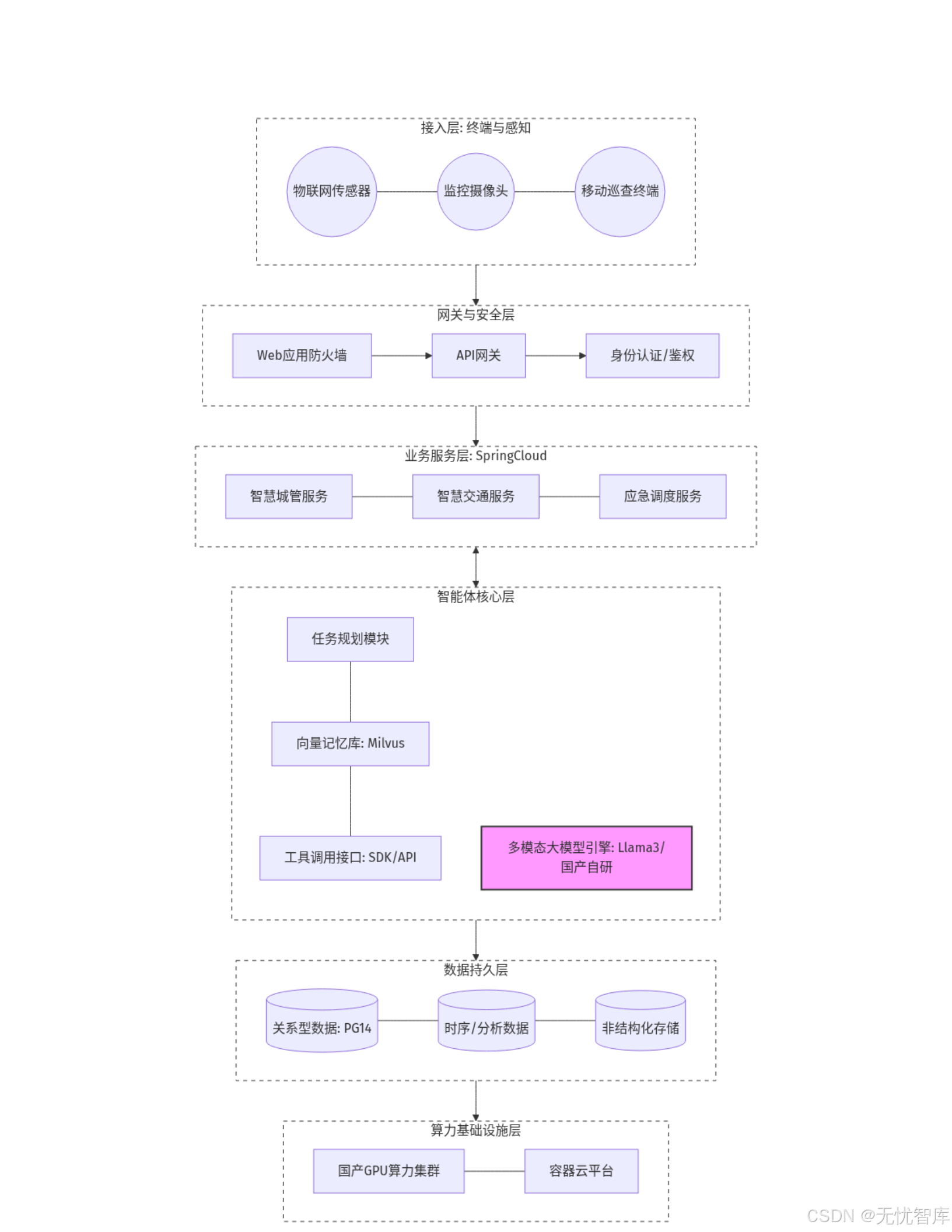 这是整个系统的"大脑"和"知识库"。其核心任务是汇聚、处理、理解来自城市各个角落的多源异构数据,并通过大模型的强大泛化能力,形成对城市运行状态的深度认知。