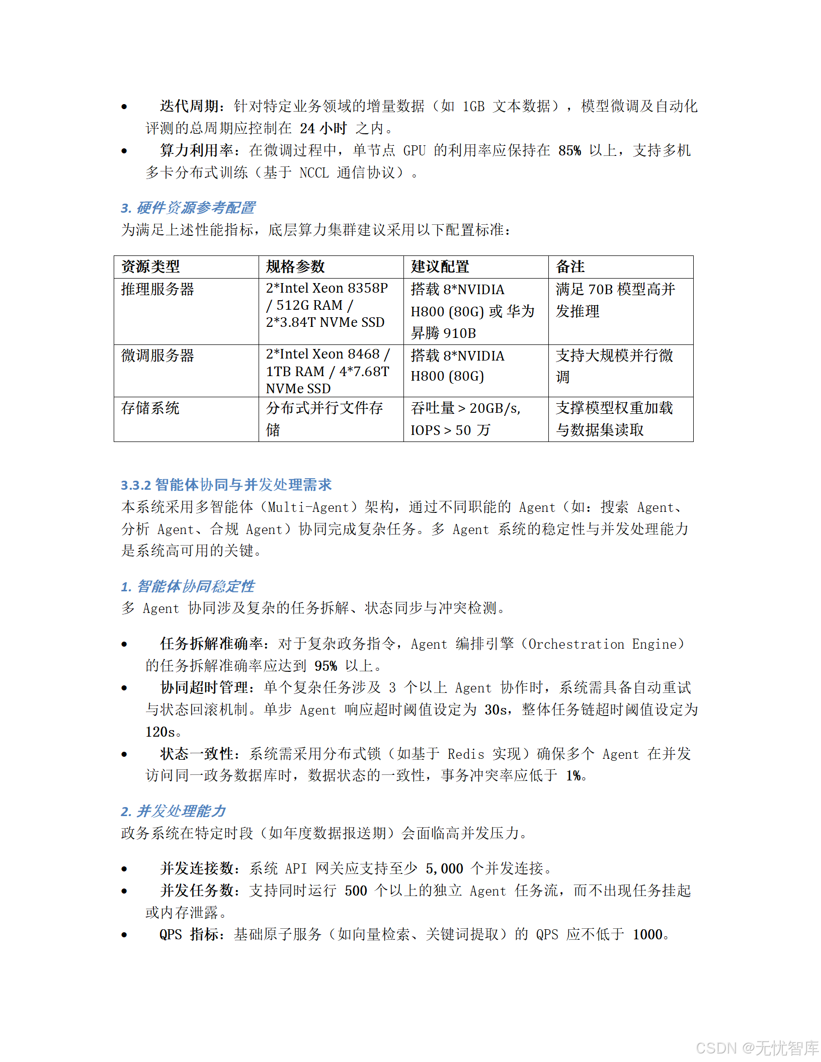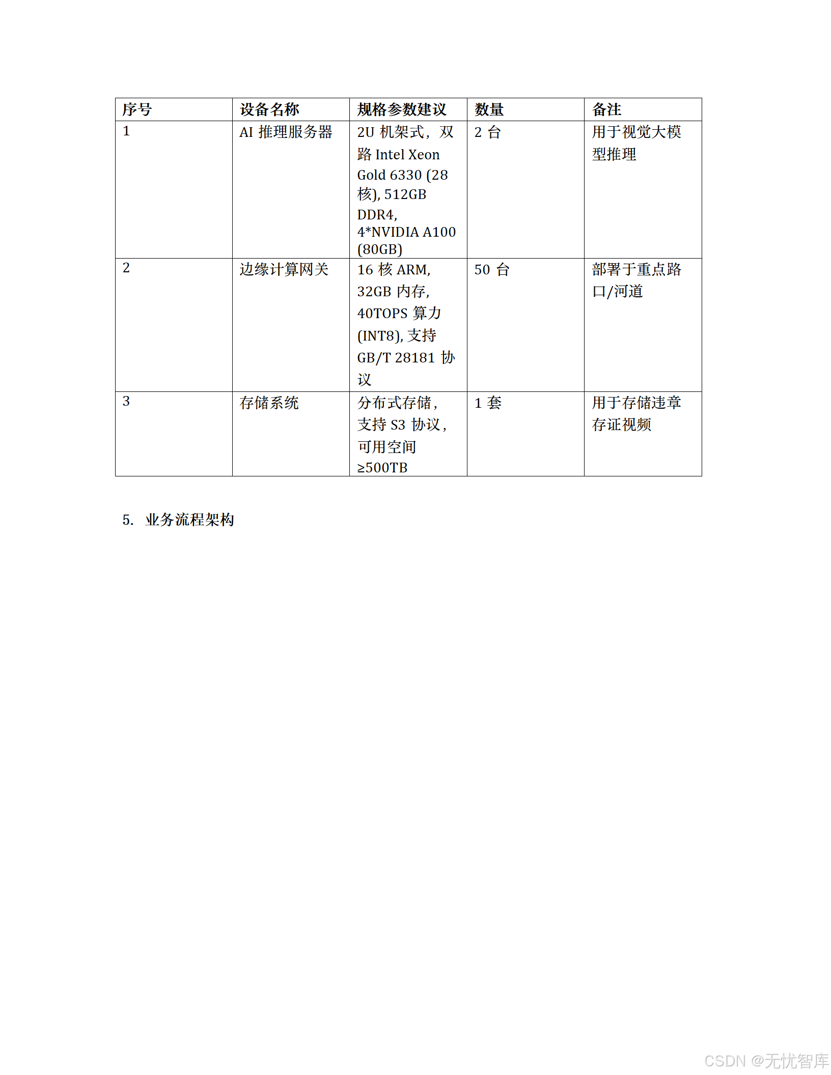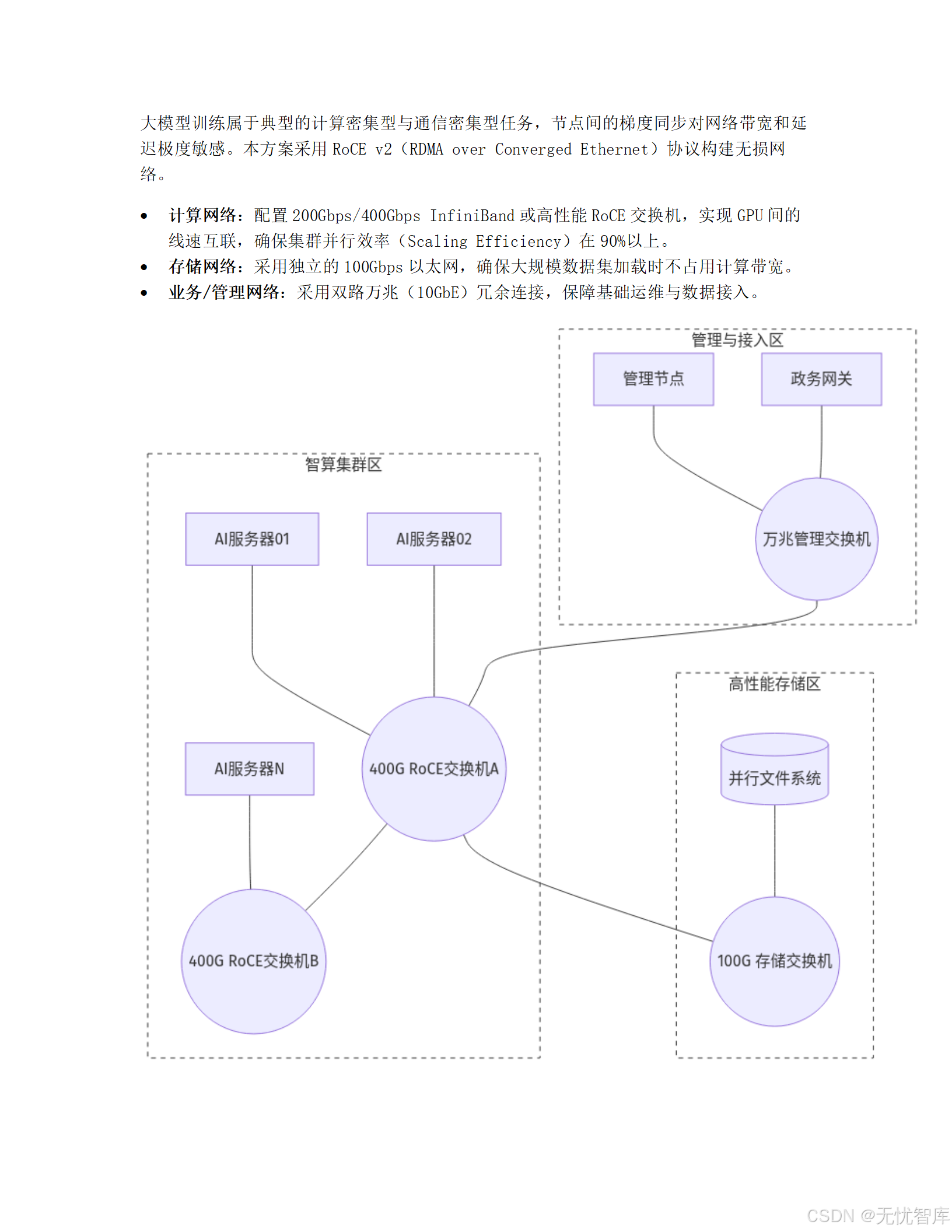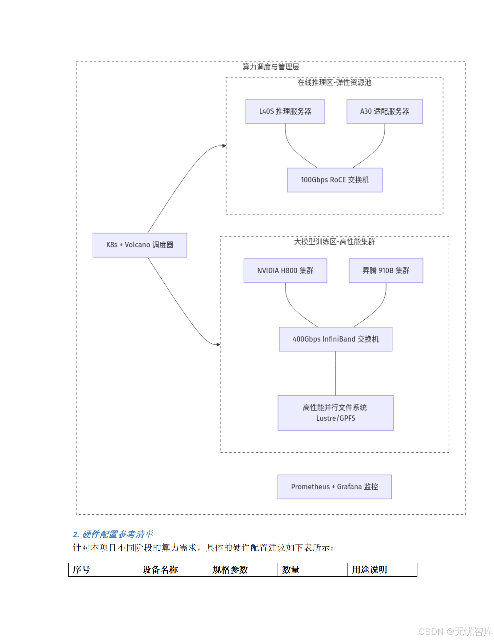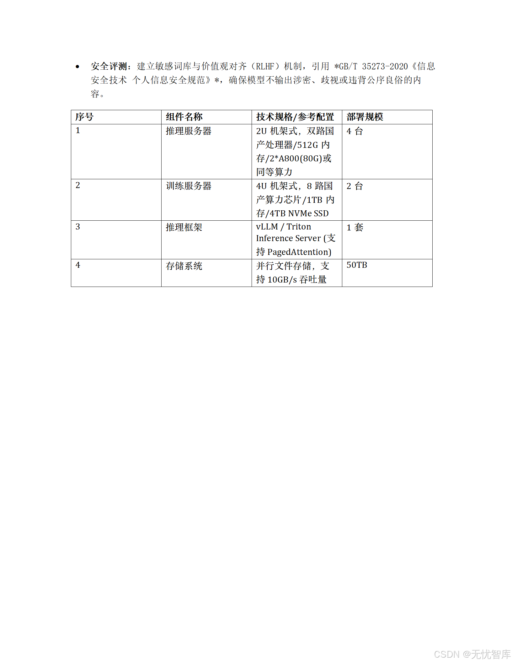 - 推理服务器:配备国产处理器和NVIDIA A800(80G)GPU,4台规模足以支撑初期业务负载。