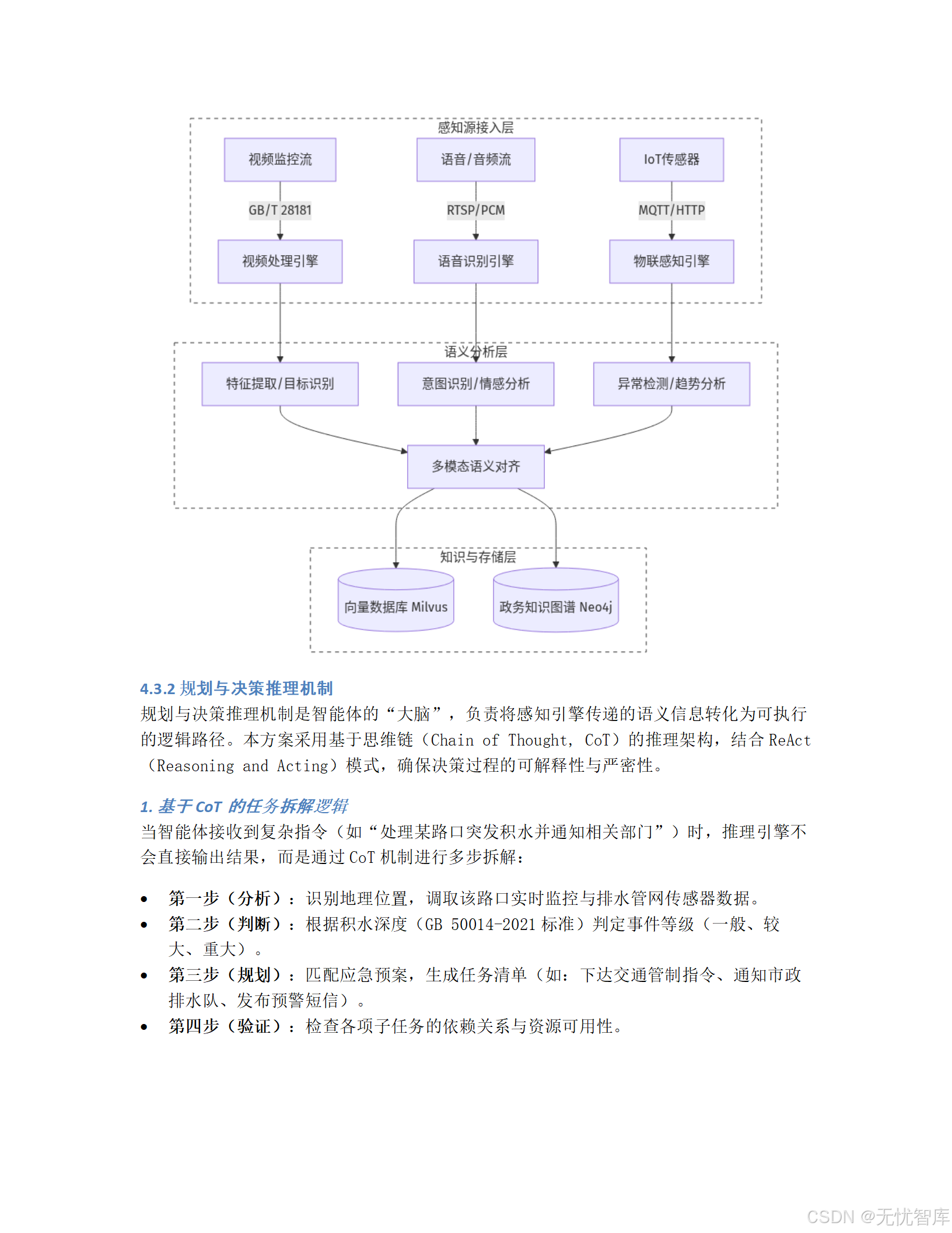 - 任务自主拆解 :采用ReAct框架,Agent能够像人类一样"思考-行动-观察"循环。例如,面对"处理某路段积水"指令,它能自主规划出"查天气→调监控→派工单→跟进度→回结果"的完整业务流。