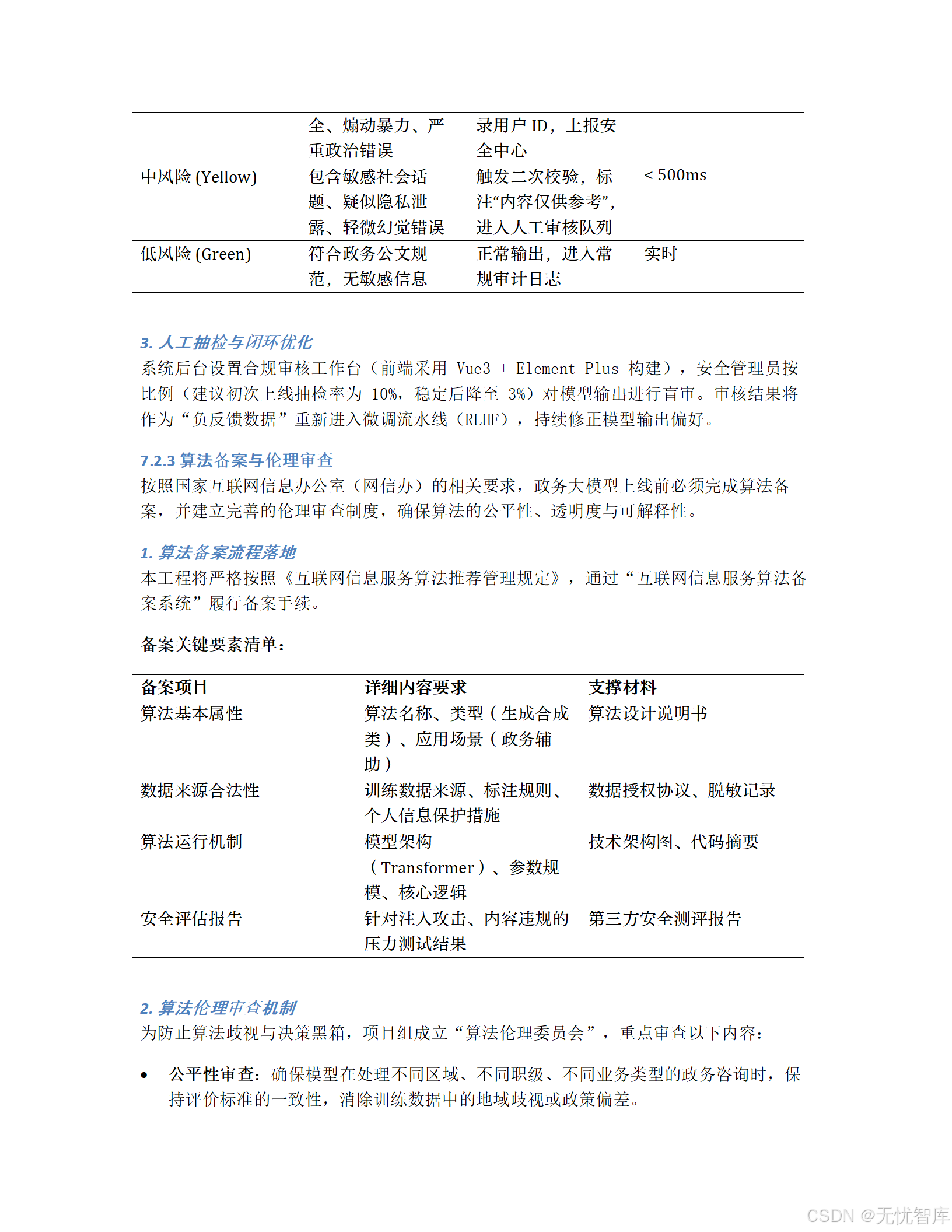 - 价值观对齐(RLHF):通过人类反馈强化学习,建立专家评分机制,确保模型输出的内容符合政府公文的严谨性、合规性,杜绝涉密、歧视或违背公序良俗的信息。