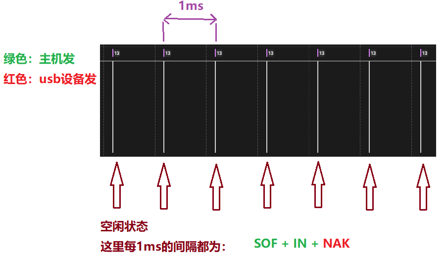 不应该是(SOF + IN + NAK) (SOF) (SOF) (SOF) (SOF) (SOF + IN + NAK):每1ms 一包SOF包,每5ms一包IN;