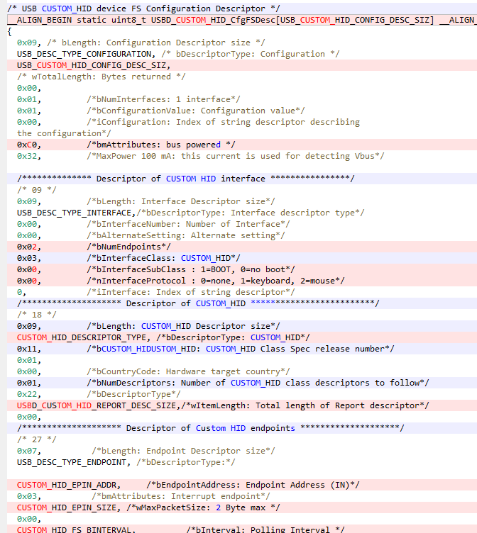 CUSTOM_HID_EPIN_SIZE / CUSTOM_HID_EPOUT_SIZE:代码里是0x02 → 代表每个端点一次最多传输 2 字节数据。这个值可以改(全速 USB 最大 64 字节),按需调整即可。