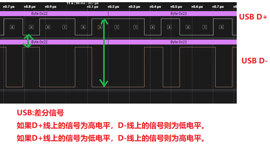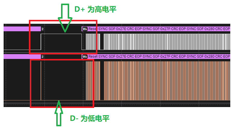 **当全速设备连接时:**D+为高电平,D-为低电平,主机通过检测这种状态来识别设备为全速设备。