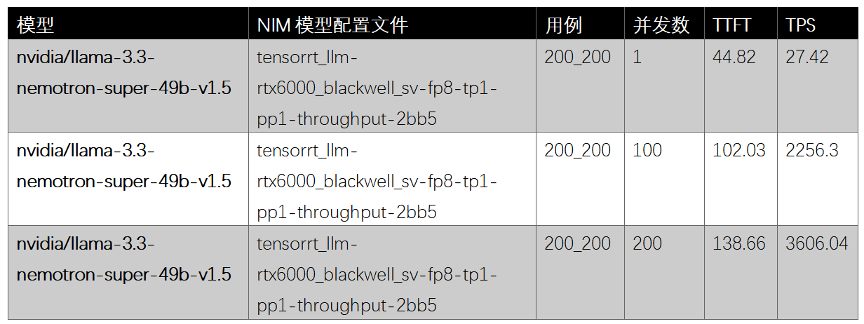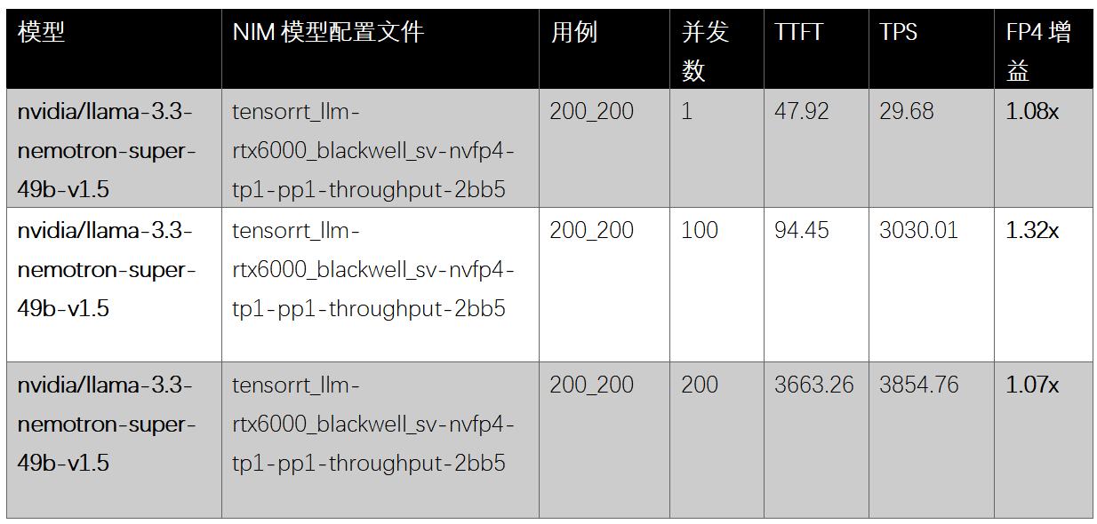 我们为同一模型使用了两个NVIDIA推理微服务配置文件,以比较精度模式并了解其对性能和效率的影响。这两个配置文件------tensorrt_llm-rtx6000_blackwell_sv-fp8-tp1-pp1-throughput-2bb5 和 tensorrt_llm-rtx6000_blackwell_sv-nvfp4-tp1-pp1-throughput-2bb5------除了精度设置外完全相同。