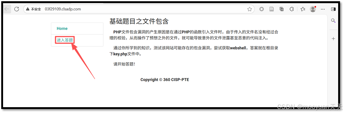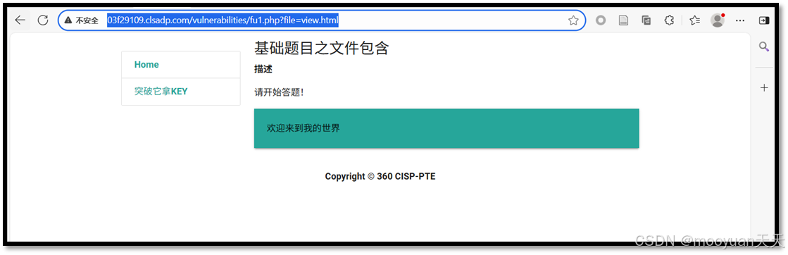 打开靶场,页面提示"PHP文件包含风险的产生原因是在通过PHP的函数引入文件时,由于传入的文件名没有经过合理的校验,从而操作了预想之外的文件,就可能导致意外的文件泄露甚至恶意的代码注入。测试该网站可能存在的文件包含风险,尝试获取webshell,答案就在根目录下key.php文件中。"