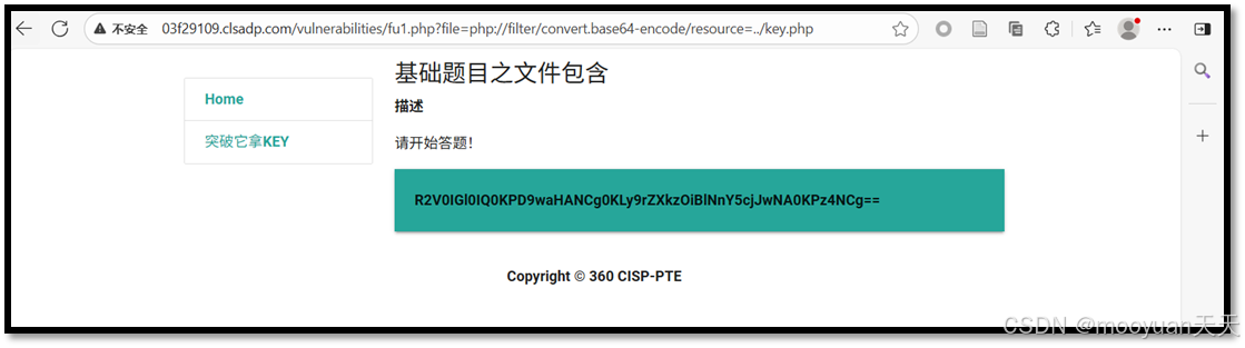 ../key.php文件的原始内容。但内容不会直接输出,而是会先通过 Base64 编码过滤器。 -