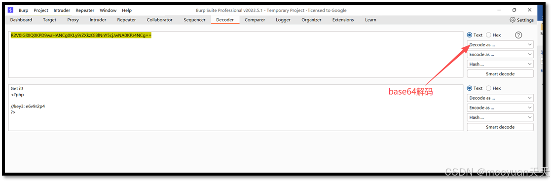 使用burpsuite的decoder模块进行base64解码,其base64编码后的值如下所示。R2V0IGl0IQ0KPD9waHANCg0KLy9rZXkzOiBlNnY5cjJwNA0KPz4NCg==