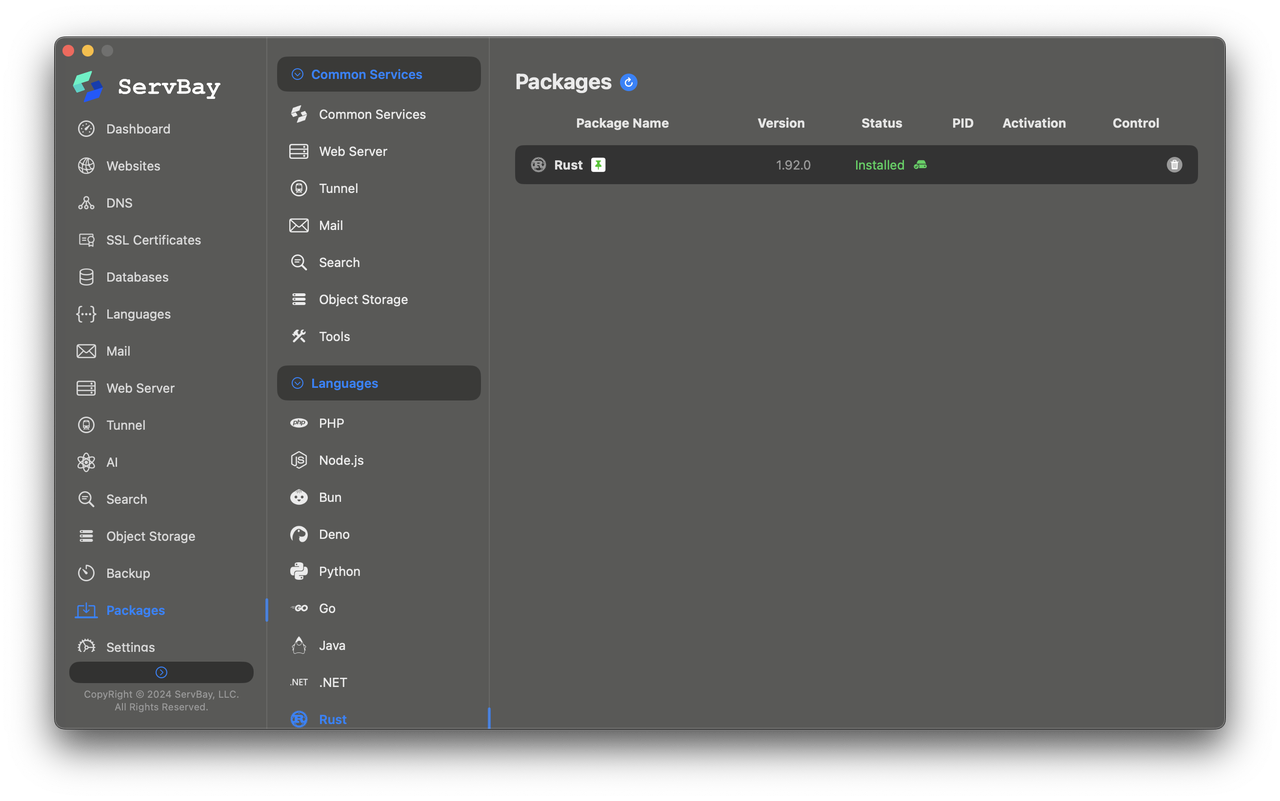 对于想要快速体验 Rust 1.92.0 新功能的开发者来说,这里推荐使用 ServBay 来统一管理开发栈。