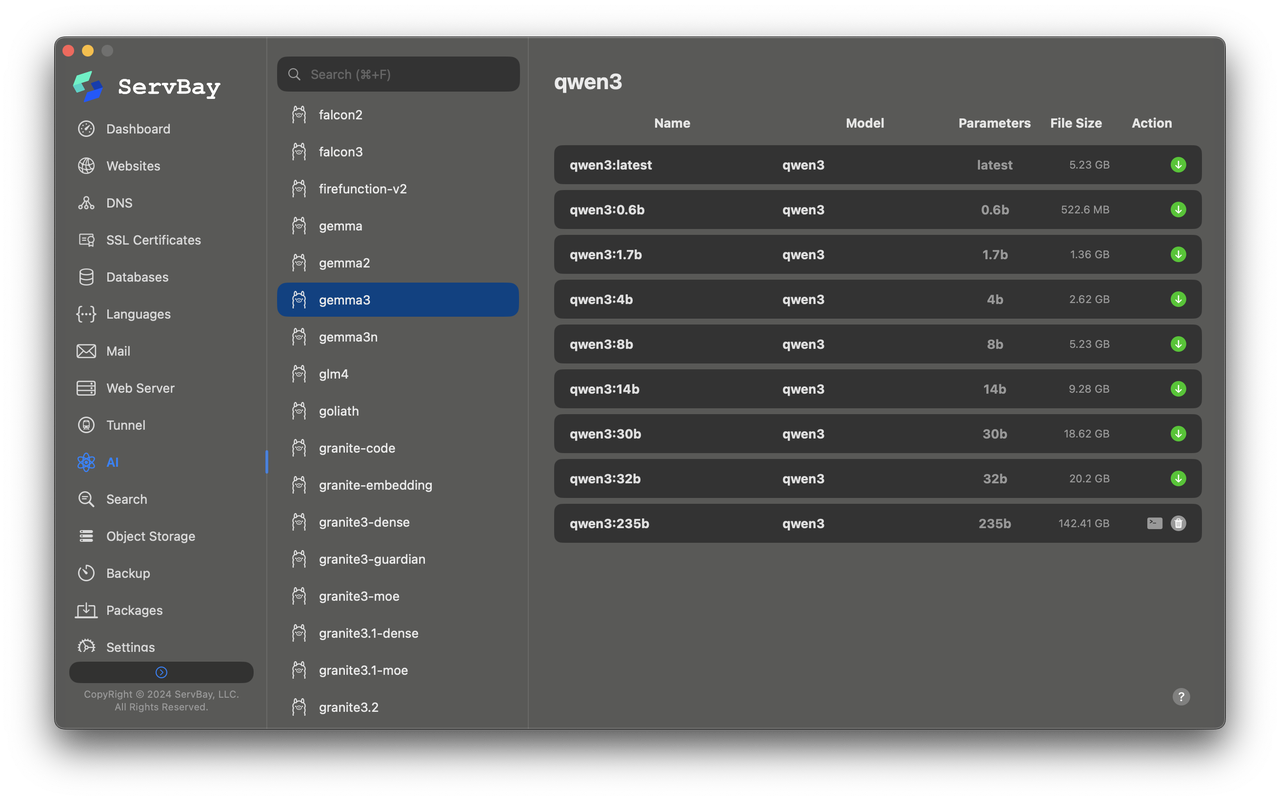 本地 AI 部署:紧跟技术趋势,ServBay 甚至支持本地 AI 模型的快速部署与运行,方便在应用中集成智能化功能。