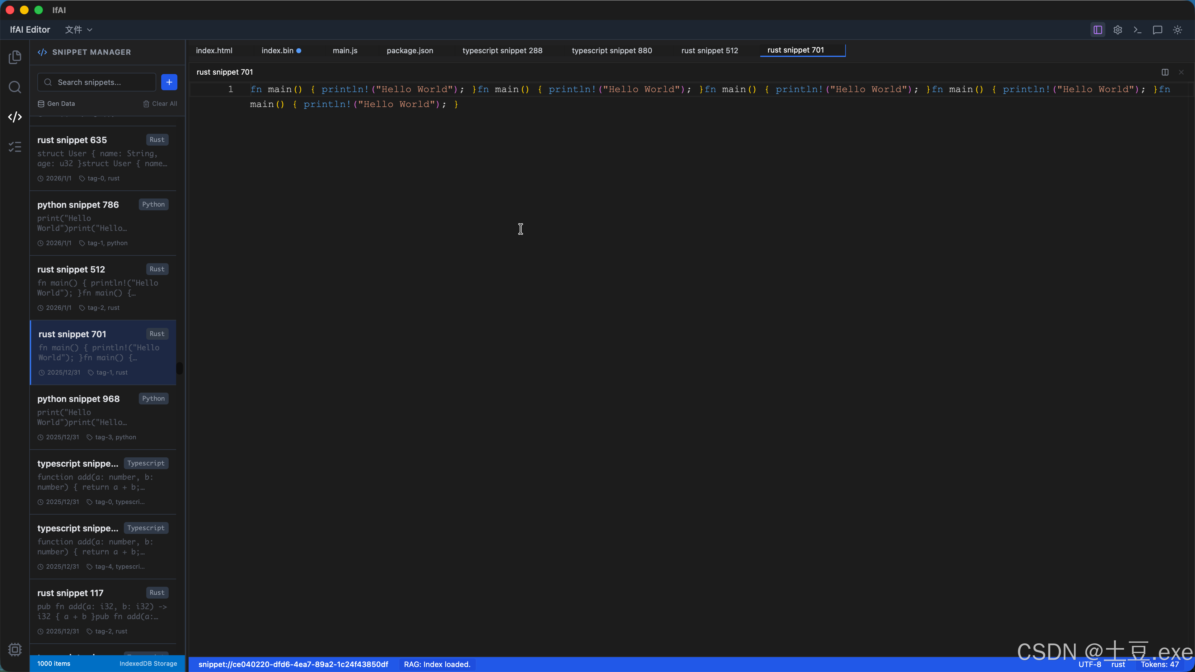 - Snippet 虚拟滚动:支持万级数据秒级加载,保持 120 FPS 顺滑度。