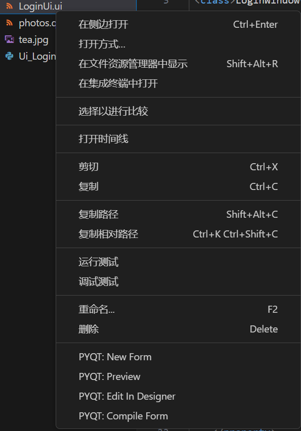 在我登录界面在Qtdesigner中创作好之后,右键点击PYQT:Compile From