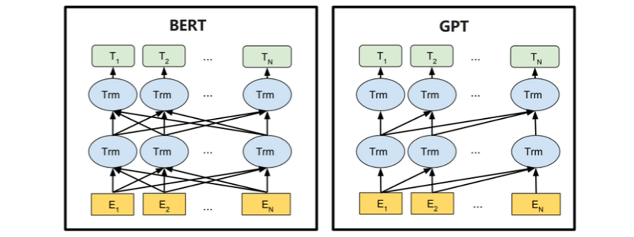 图中表示的是Bert相比于GPT,它是一个双向的RNN结构。Bert通过双向自注意力机制,在建模每个 token 表示时同时整合左右两个方向的上下文信息,从而获得更准确、更丰富的语义表示。