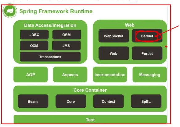 从 Spring 的架构图可以看到,SpringMVC 对应的是Web 模块下的 Servlet 组件: