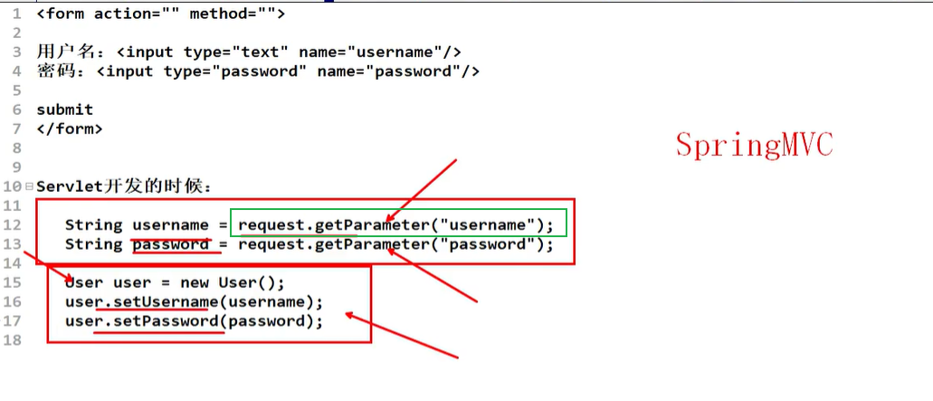 原生 Servlet 接收表单参数时,需要手动调用request.getParameter("username"),再逐个赋值给 JavaBean;而 SpringMVC 支持自动将表单数据绑定到 JavaBean------ 只需在 Controller 方法参数中声明实体类,框架会自动把请求参数封装进去: