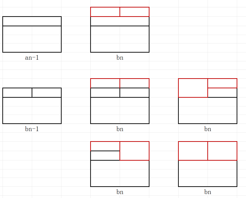 **方法:**很明显的dp题,关键就是状态转移方程怎么想,由于塔的宽度仅为2,所以我们分析塔的一行,可以发现有两种情况,一个是塔的一行是同一个方块,一个则是来自不同方块,我们分别将这两种类型记作a和b,最终的方法数就是an+bn,接下来分析an和bn的计算: