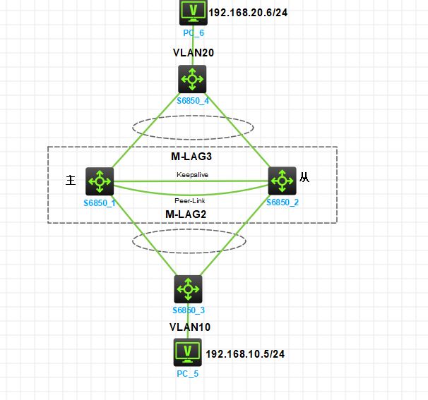实验需求:实现两台PC可以相互ping通。SW1和SW2的双活架构,完成设备间的Peer-Link互联、Keepalive心跳检测,跨设备业务链路聚合,实现PC5使用VRRP双活网关,PC6使用M-LAG双活网关。