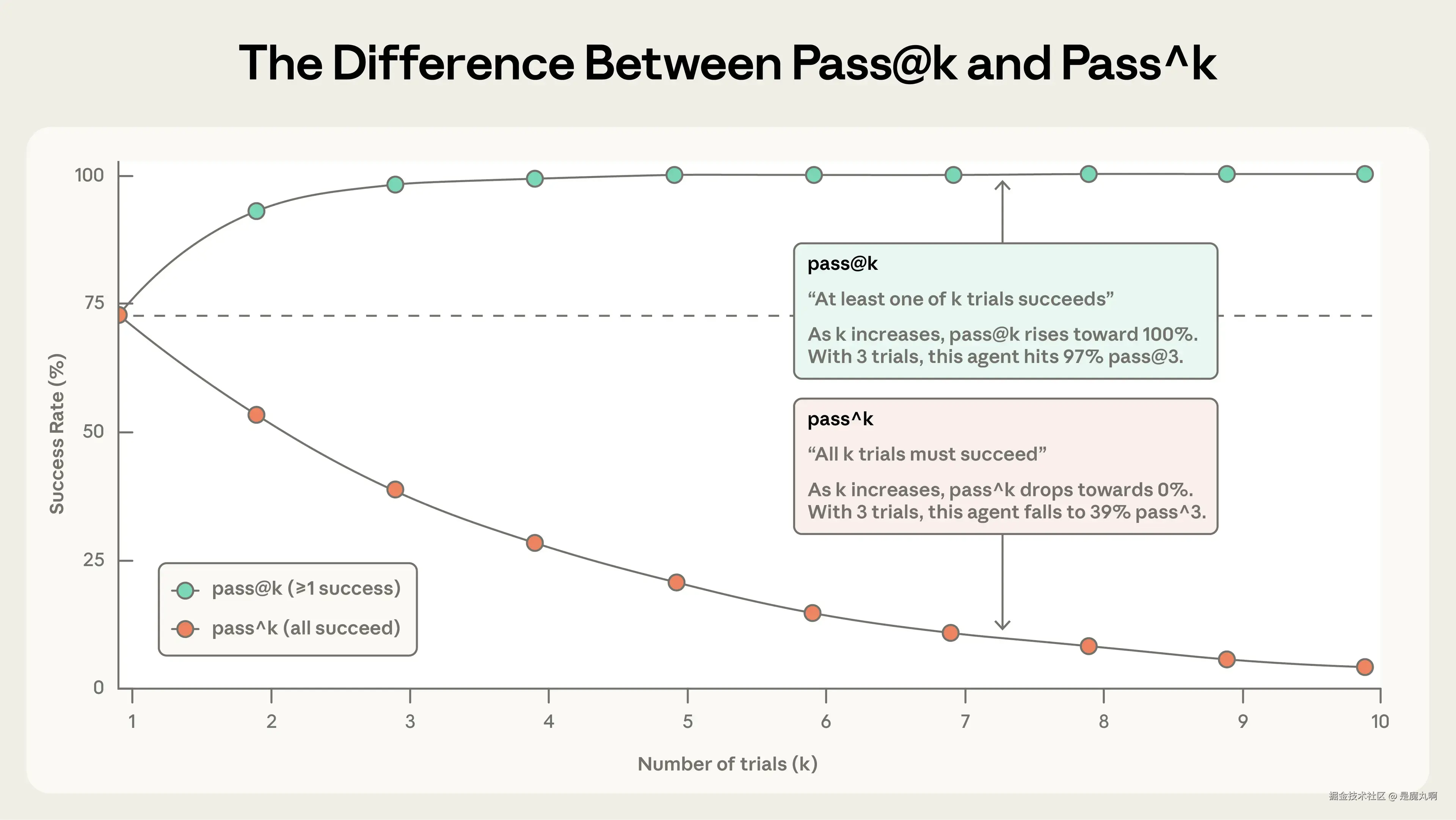 随着试验增加,pass@k 和 pass^k 出现分化。在 k=1 时,它们相同(都等于每次试验的成功率)。到 k=10 时,它们讲述相反的故事:pass@k 接近 100%,而 pass^k 下降到 0%。