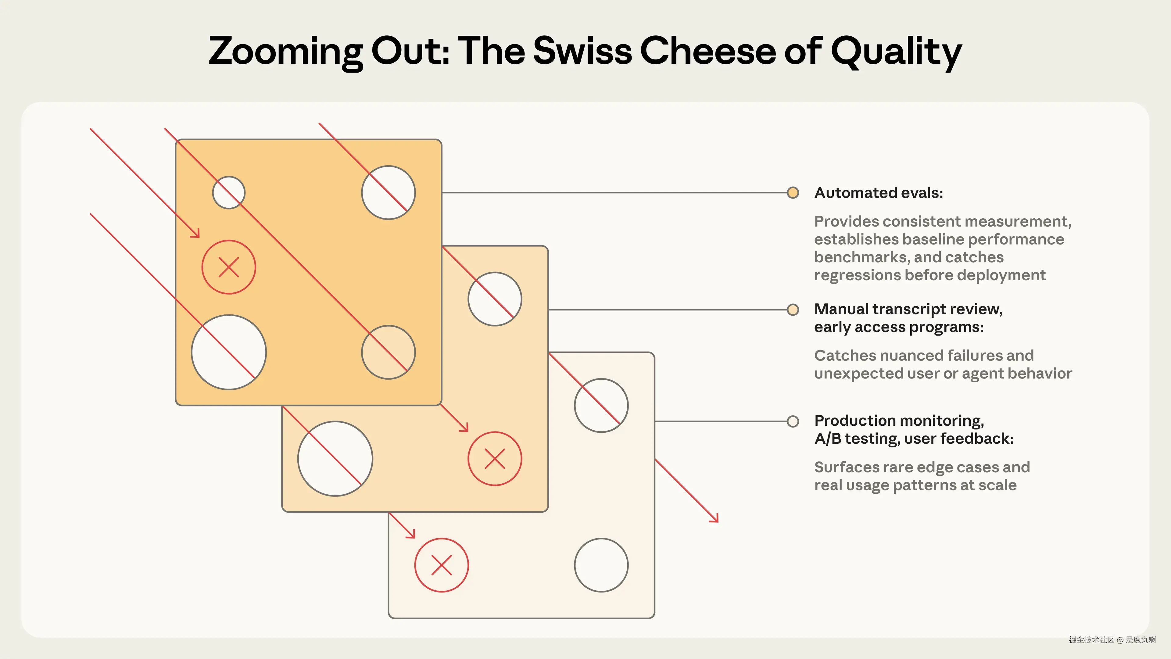 像安全工程中的瑞士奶酪模型一样,没有单一的评估层能捕捉到每个问题。结合多种方法,穿过一层的失败会被另一层捕获。