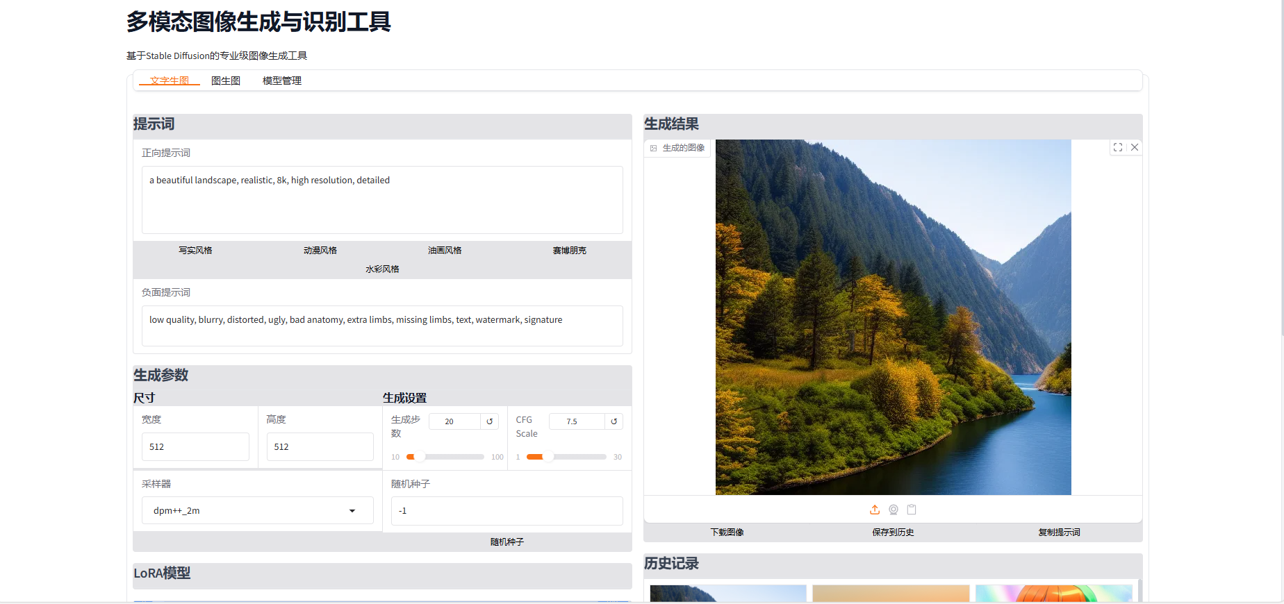 本项目基于Stable Diffusion开发了一款功能完整、性能优良、用户体验良好的多模态图像生成与识别工具。该工具支持文字生图、图生图、局部重绘等多种生成模式,并提供了LoRA模型管理功能,允许用户扩展和定制生成效果。