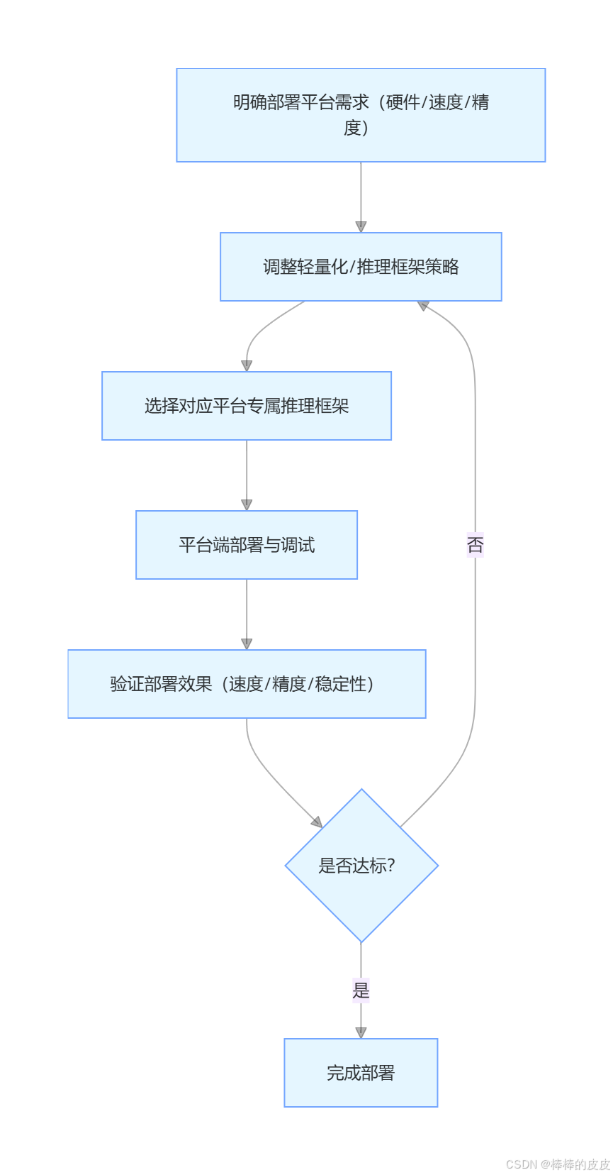 不同平台的硬件算力、存储资源、实时性要求差异显著,部署需遵循 "平台适配优先、轻量化先行、精度损失可控(≤3%)" 的原则,核心流程如下: