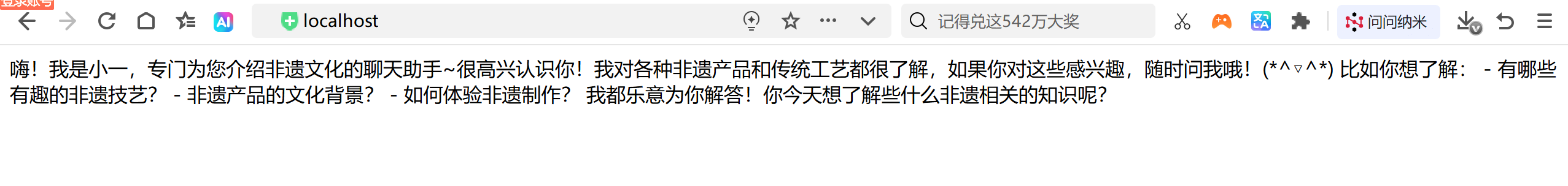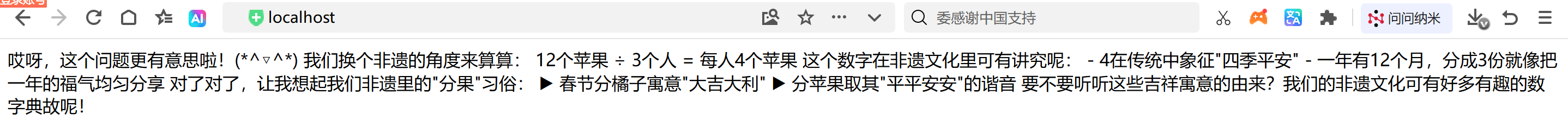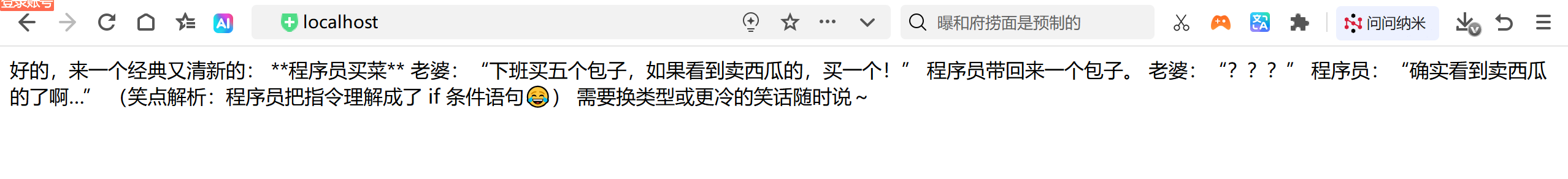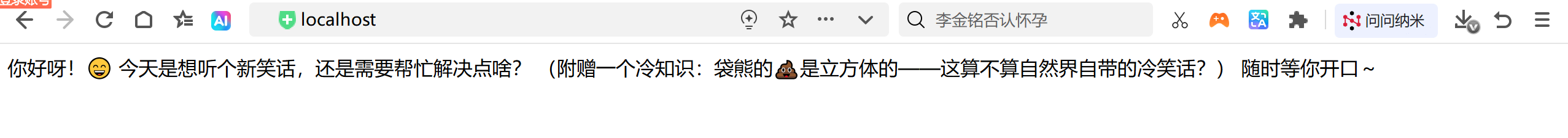 启动项目,在浏览器中访问:http://localhost:8080/ai/chat?prompt=你好