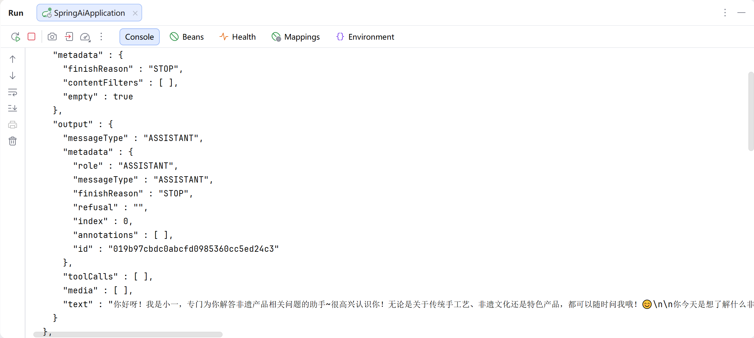 重启项目,再次聊天就能看到AI对话的日志信息了~