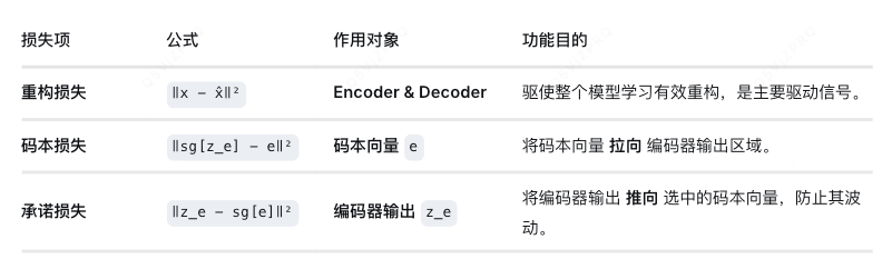 - 双向对齐 :通过码本损失 和承诺损失,从两个方向拉近编码器输出空间和码本向量空间,迫使它们对齐。