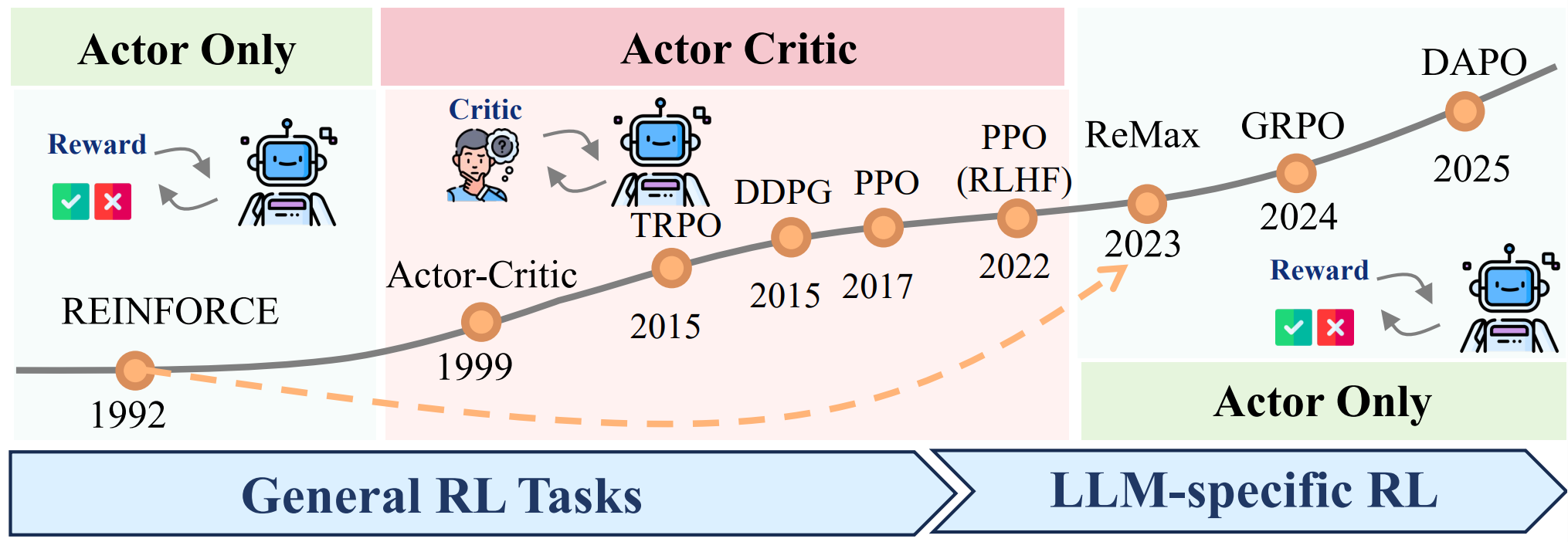 在本综述中,我们从三个关键维度追溯了 rl4llm 的发展脉络。