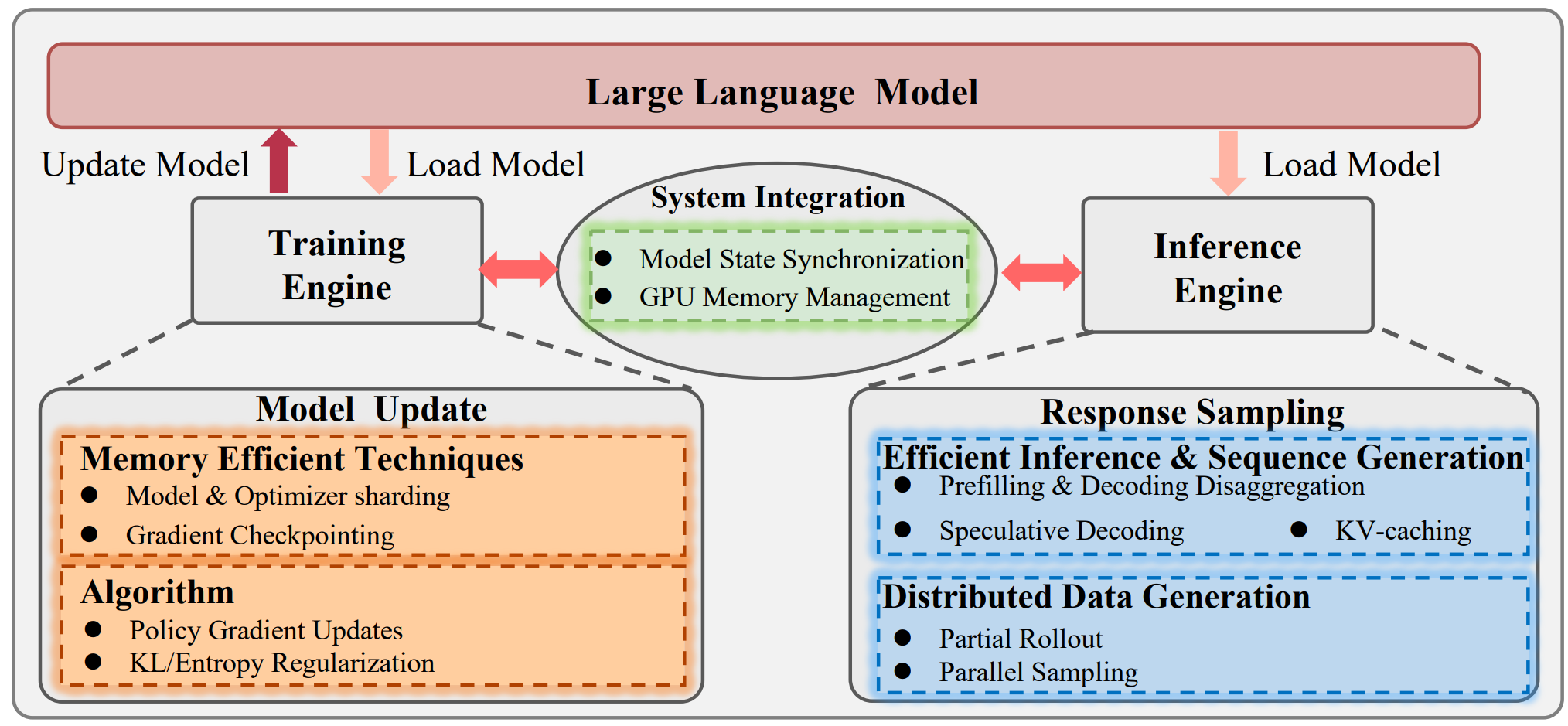 - 与之并行的是,由推理 引擎执行的响应采样流程,会通过prefilling与decoding解耦、投机性解码、KV-cache、partial rollout、并行采样等技术,高效完成新数据的生成。