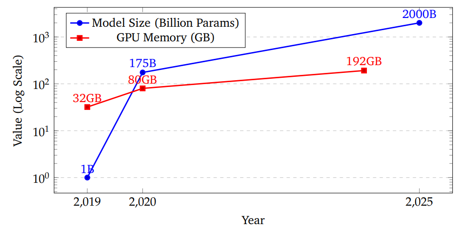并且参数量 增长速度远快于 GPU 显存增长速度。