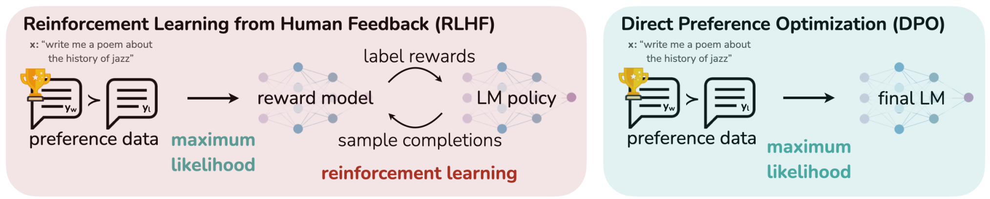 DPO 简化了训练流程,无需显式训练奖励模型。
