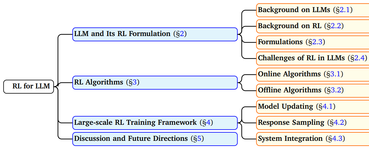 - 未来研究方向与开放问题 :RL-LLM交叉领域的潜在研究方向,包括现有方法的必要改进方案、样本高效 学习的新兴技术、解决当前可扩展性与稳定性 瓶颈的策略,以及通过多模态 融合和智能体化大语言模型系统构建提升模型能力的路径。