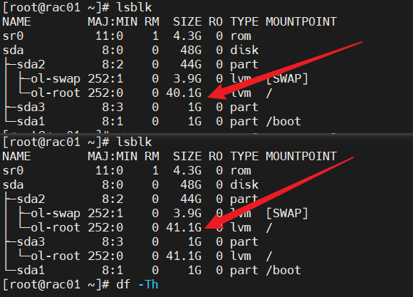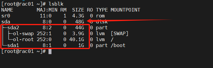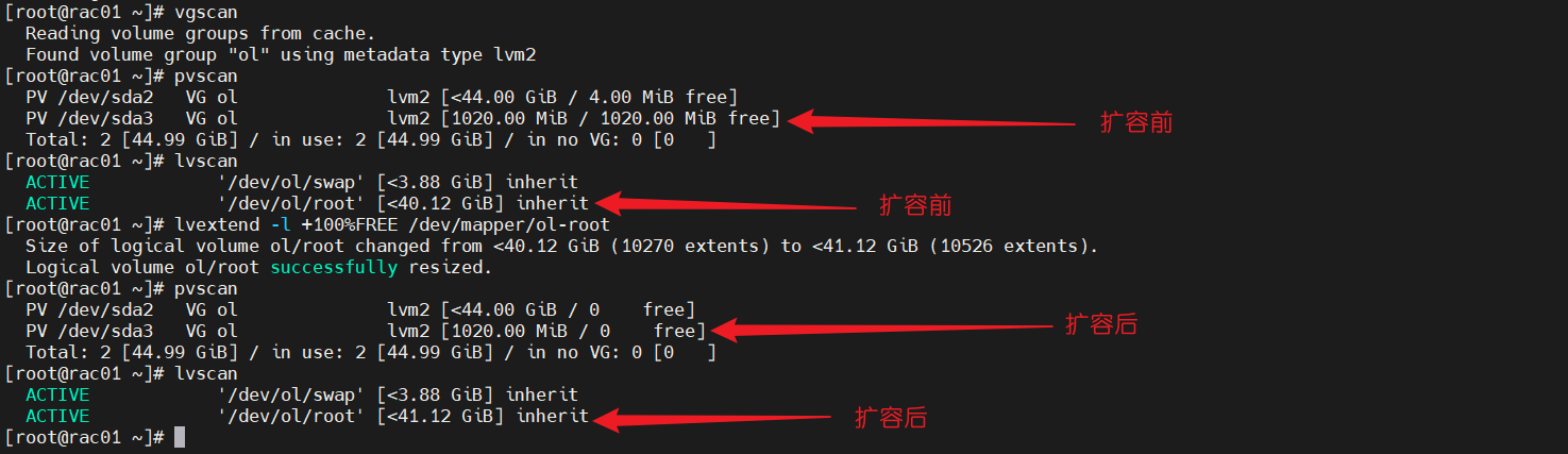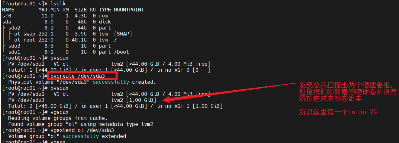 root@rac01 \~\]# df -Th 文件系统 类型 容量 已用 可用 已用% 挂载点 devtmpfs devtmpfs 1.8G 0 1.8G 0% /dev tmpfs tmpfs 1.8G 0 1.8G 0% /dev/shm tmpfs tmpfs 1.8G 8.8M 1.8G 1% /run tmpfs tmpfs 1.8G 0 1.8G 0% /sys/fs/cgroup /dev/mapper/ol-root xfs 41G 29G 12G 71% / /dev/sda1 xfs 1014M 179M 836M 18% /boot tmpfs tmpfs 368M 0 368M 0% /run/user/0 可以看到,我们扩展的磁盘大小已经被识别到,但是仅仅只是在逻辑层面增加了这些空间,并没有被操作系统纳入使用。  ### 2.2.使用LVM方式进行扩展分区(方式一) #### 2.2.1.添加磁盘分区 ```bash [root@rac01 ~]# lsblk NAME MAJ:MIN RM SIZE RO TYPE MOUNTPOINT sr0 11:0 1 4.3G 0 rom sda 8:0 0 48G 0 disk ├─sda2 8:2 0 44G 0 part │ ├─ol-swap 252:1 0 3.9G 0 lvm [SWAP] │ └─ol-root 252:0 0 40.1G 0 lvm / └─sda1 8:1 0 1G 0 part /boot [root@rac01 ~]# df -Th 文件系统 类型 容量 已用 可用 已用% 挂载点 devtmpfs devtmpfs 1.8G 0 1.8G 0% /dev tmpfs tmpfs 1.8G 0 1.8G 0% /dev/shm tmpfs tmpfs 1.8G 8.8M 1.8G 1% /run tmpfs tmpfs 1.8G 0 1.8G 0% /sys/fs/cgroup /dev/mapper/ol-root xfs 41G 29G 12G 71% / /dev/sda1 xfs 1014M 179M 836M 18% /boot tmpfs tmpfs 368M 0 368M 0% /run/user/0 [root@rac01 ~]# fdisk /dev/sda 欢迎使用 fdisk (util-linux 2.23.2)。 更改将停留在内存中,直到您决定将更改写入磁盘。 使用写入命令前请三思。 命令(输入 m 获取帮助):m 命令操作 a toggle a bootable flag b edit bsd disklabel c toggle the dos compatibility flag d delete a partition g create a new empty GPT partition table G create an IRIX (SGI) partition table l list known partition types m print this menu n add a new partition o create a new empty DOS partition table p print the partition table q quit without saving changes s create a new empty Sun disklabel t change a partition's system id u change display/entry units v verify the partition table w write table to disk and exit x extra functionality (experts only) 命令(输入 m 获取帮助):n Partition type: p primary (2 primary, 0 extended, 2 free) e extended Select (default p): Using default response p 分区号 (3,4,默认 3): 起始 扇区 (94371840-100663295,默认为 94371840): 将使用默认值 94371840 Last 扇区, +扇区 or +size{K,M,G} (94371840-100663295,默认为 100663295):+1G 分区 3 已设置为 Linux 类型,大小设为 1 GiB 命令(输入 m 获取帮助):w The partition table has been altered! Calling ioctl() to re-read partition table. WARNING: Re-reading the partition table failed with error 16: 设备或资源忙. The kernel still uses the old table. The new table will be used at the next reboot or after you run partprobe(8) or kpartx(8) 正在同步磁盘。 [root@rac01 ~]# ``` #### 2.2.2.刷新操作系统磁盘分区表 记得执行partprobe /dev/sda刷新分区表!!!!!!! ```bash [root@rac01 ~]# partprobe /dev/sda [root@rac01 ~]# lsblk NAME MAJ:MIN RM SIZE RO TYPE MOUNTPOINT sr0 11:0 1 4.3G 0 rom sda 8:0 0 48G 0 disk ├─sda2 8:2 0 44G 0 part │ ├─ol-swap 252:1 0 3.9G 0 lvm [SWAP] │ └─ol-root 252:0 0 40.1G 0 lvm / ├─sda3 8:3 0 1G 0 part └─sda1 8:1 0 1G 0 part /boot [root@rac01 ~]# ``` #### 2.2.3.添加完磁盘分区之后,我们才开始进行LVM管理,三个主要步骤+一个重要步骤:(pv -\> vg -\> lv -\> 调整文件系统) ##### 步骤一:pvcreate /dev/sda3 ```bash [root@rac01 ~]# partprobe /dev/sda [root@rac01 ~]# lsblk NAME MAJ:MIN RM SIZE RO TYPE MOUNTPOINT sr0 11:0 1 4.3G 0 rom sda 8:0 0 48G 0 disk ├─sda2 8:2 0 44G 0 part │ ├─ol-swap 252:1 0 3.9G 0 lvm [SWAP] │ └─ol-root 252:0 0 40.1G 0 lvm / ├─sda3 8:3 0 1G 0 part └─sda1 8:1 0 1G 0 part /boot [root@rac01 ~]# pvscan PV /dev/sda2 VG ol lvm2 [<44.00 GiB / 4.00 MiB free] Total: 1 [<44.00 GiB] / in use: 1 [<44.00 GiB] / in no VG: 0 [0 ] [root@rac01 ~]# pvcreate /dev/sda3 Physical volume "/dev/sda3" successfully created. [root@rac01 ~]# pvscan PV /dev/sda2 VG ol lvm2 [<44.00 GiB / 4.00 MiB free] PV /dev/sda3 lvm2 [1.00 GiB] Total: 2 [<45.00 GiB] / in use: 1 [<44.00 GiB] / in no VG: 1 [1.00 GiB] [root@rac01 ~]# ``` 从上边的执行过程就可以看出我们当前已经创建出了一个新的物理卷,如下图:  ##### 步骤二:将刚创建好的物理卷添加到/dev/mapper/ol-root所在的卷组 vgextend /ol/dev/sda3 ```bash [root@rac01 ~]# pvscan PV /dev/sda2 VG ol lvm2 [<44.00 GiB / 4.00 MiB free] Total: 1 [<44.00 GiB] / in use: 1 [<44.00 GiB] / in no VG: 0 [0 ] [root@rac01 ~]# pvcreate /dev/sda3 Physical volume "/dev/sda3" successfully created. [root@rac01 ~]# pvscan PV /dev/sda2 VG ol lvm2 [<44.00 GiB / 4.00 MiB free] PV /dev/sda3 lvm2 [1.00 GiB] Total: 2 [<45.00 GiB] / in use: 1 [<44.00 GiB] / in no VG: 1 [1.00 GiB] [root@rac01 ~]# vgscan Reading volume groups from cache. Found volume group "ol" using metadata type lvm2 [root@rac01 ~]# vgextend ol /dev/sda3 Volume group "ol" successfully extended [root@rac01 ~]# vgsan -bash: vgsan: 未找到命令 [root@rac01 ~]# vgscan Reading volume groups from cache. Found volume group "ol" using metadata type lvm2 [root@rac01 ~]# pvscan PV /dev/sda2 VG ol lvm2 [<44.00 GiB / 4.00 MiB free] PV /dev/sda3 VG ol lvm2 [1020.00 MiB / 1020.00 MiB free] Total: 2 [44.99 GiB] / in use: 2 [44.99 GiB] / in no VG: 0 [0 ] [root@rac01 ~]# ``` ##### 步骤三:扩容逻辑卷/dev/mapper/ol-root # 将卷组中的空闲空间扩展到根分区逻辑卷: lvextend -l +100%FREE /dev/mapper/ol-root # 若想指定大小分配,则可以使用: lvcreate -L 2GB -n LV_Name VG_NAME ```bash [root@rac01 ~]# vgscan Reading volume groups from cache. Found volume group "ol" using metadata type lvm2 [root@rac01 ~]# pvscan PV /dev/sda2 VG ol lvm2 [<44.00 GiB / 4.00 MiB free] PV /dev/sda3 VG ol lvm2 [1020.00 MiB / 1020.00 MiB free] Total: 2 [44.99 GiB] / in use: 2 [44.99 GiB] / in no VG: 0 [0 ] [root@rac01 ~]# lvscan ACTIVE '/dev/ol/swap' [<3.88 GiB] inherit ACTIVE '/dev/ol/root' [<40.12 GiB] inherit [root@rac01 ~]# lvextend -l +100%FREE /dev/mapper/ol-root Size of logical vo
