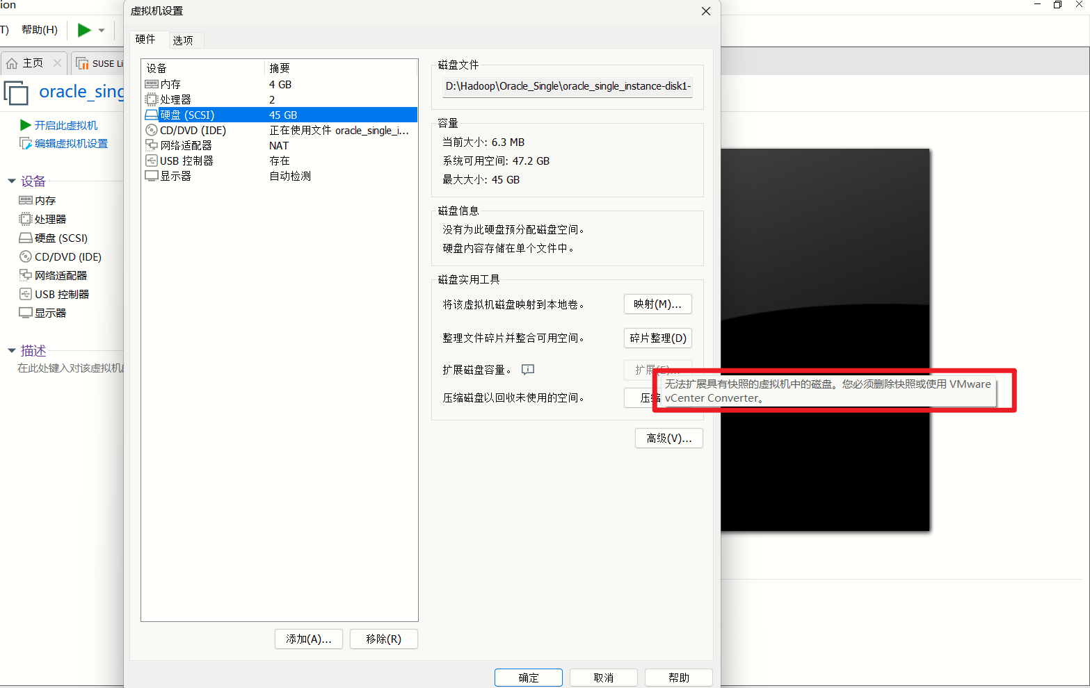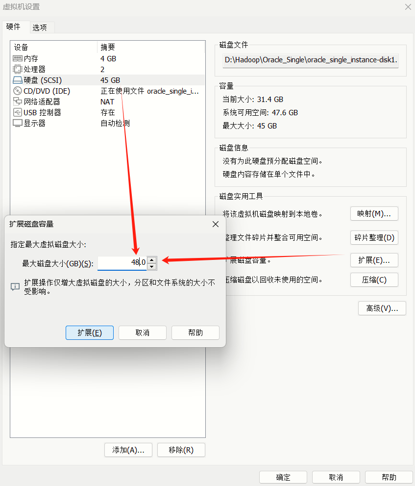关闭虚拟机,将磁盘从45G扩展至48GB(前提:虚拟机不存在快照),然后开机,你也可以在扩展完磁盘之后,再打个快照。