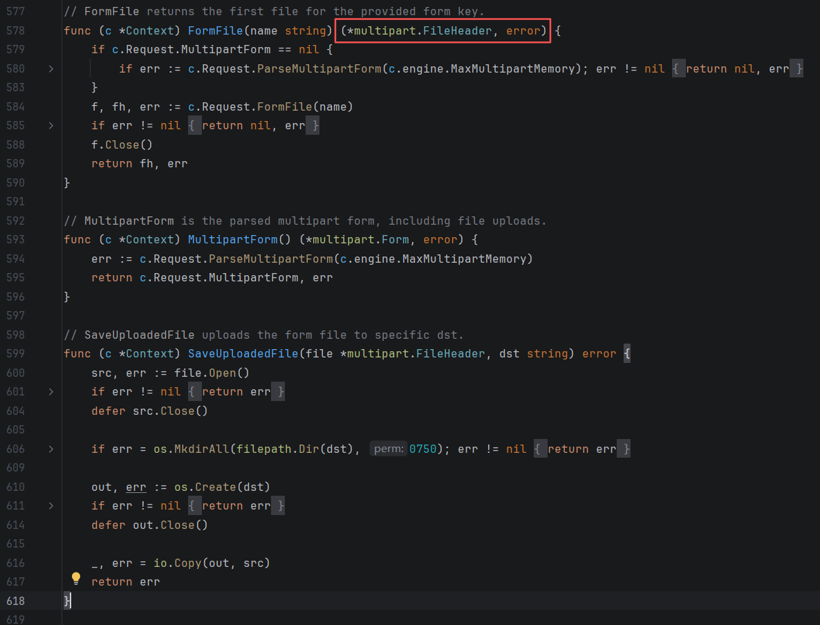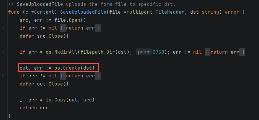 SaveUploadedFile函数要求上传的第一个参数为multipart.FileHeader对象,刚好我们在前面看到FormFile函数的第一个返回值就为这个,第二个返回值error会被Pongo2模板引擎自动处理不用管,那我们用FormFile函数来获取该对象就可以
