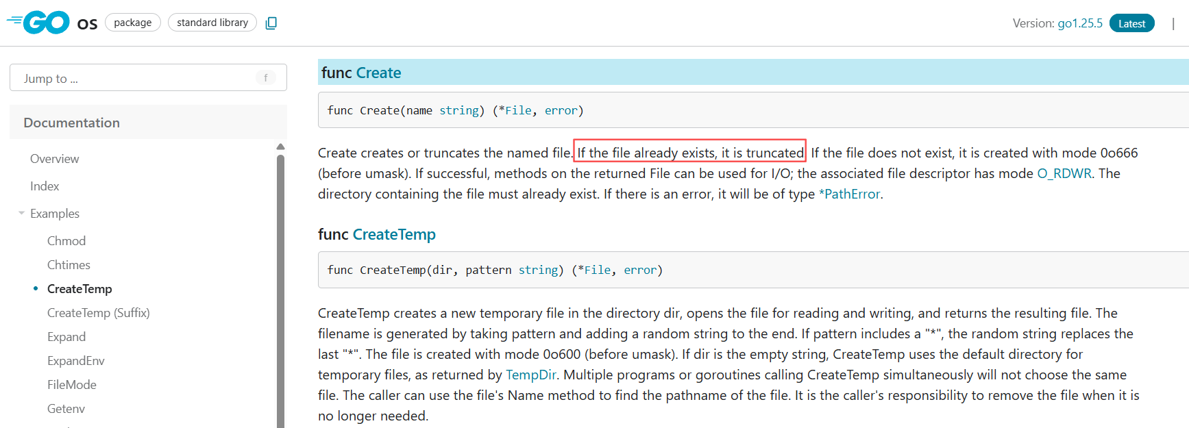 但我们不知道该函数能否把已经存在的文件给覆盖掉,里面有个os.Create函数,我们查阅官方文档可以看到https://pkg.go.dev/os#Create