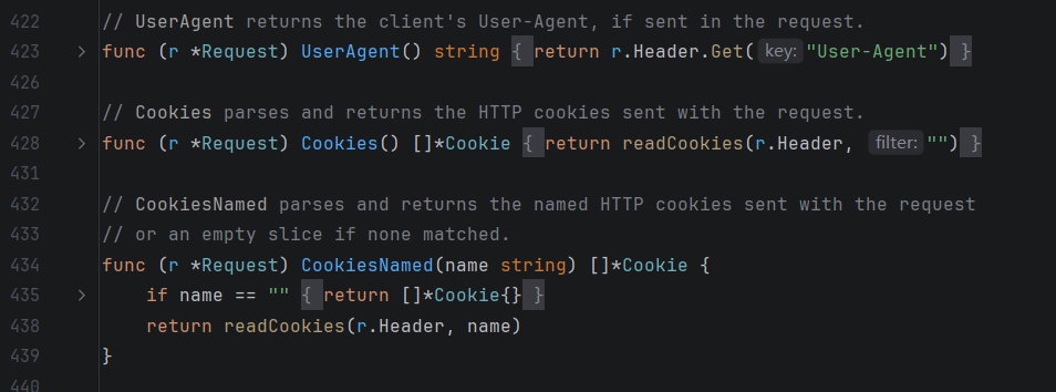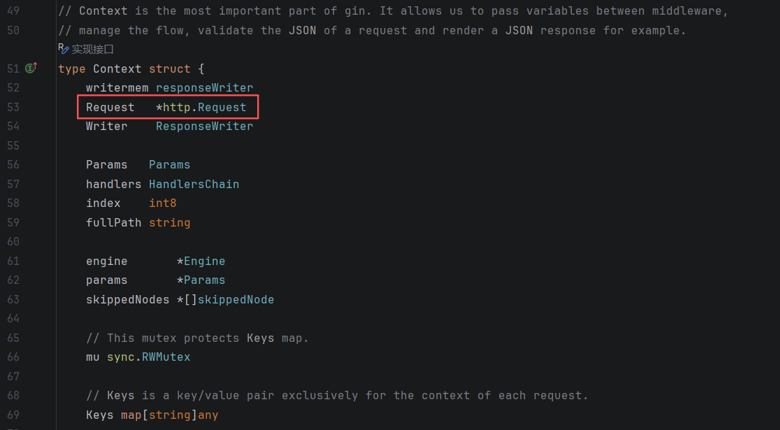 可以看到,Context结构体中有一个名为Request的字段,类型为指向http.Request的指针,用来保存当前HTTP请求对象。继续跟进Request看看