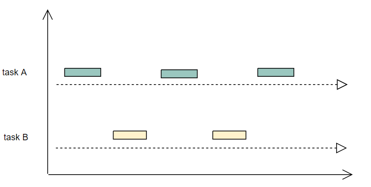 如图3.1所示,两个任务一直运行,切实同时运行着,这就是并行模式,要注意并行的话一定要有多个核的支持,因为只有一个cpu的话,同一时间只能跑一个任务,如图3.2所示,两个任务,每次只执行一小段,这样交叉的执行,就是并发模式,并发模式在单核cpu上是可以完成的。