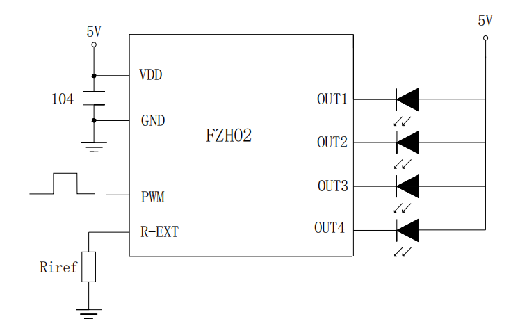 如上图所示,是 FZH02 的 5V 应用电路图。在 5V 供电情况下,每个输出端口接一个灯珠,输出端口和 VDD 端口都可以不用连接电阻。PWM 端口可以直接通过程序控制灯珠的亮度。
