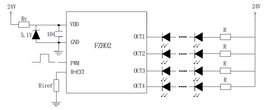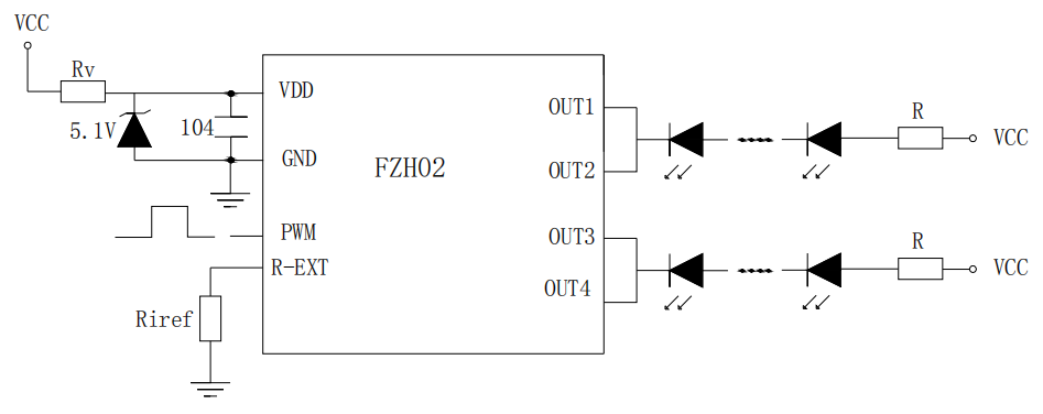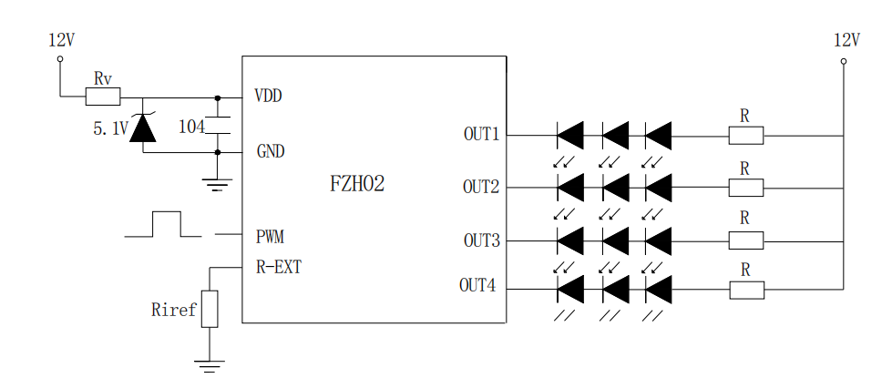如上图所示,是 FZH02 的 12V 应用电路图。在 12V 供电情况下,需要有稳压管给 VDD 端口提供5V 左右的电压。每个输出端口可以接 3 个串联的灯珠。如果灯珠是红色灯珠则要接电阻R,如不是红灯可以省掉电阻。PWM 端口可以直接通过程序控制灯珠的亮度。